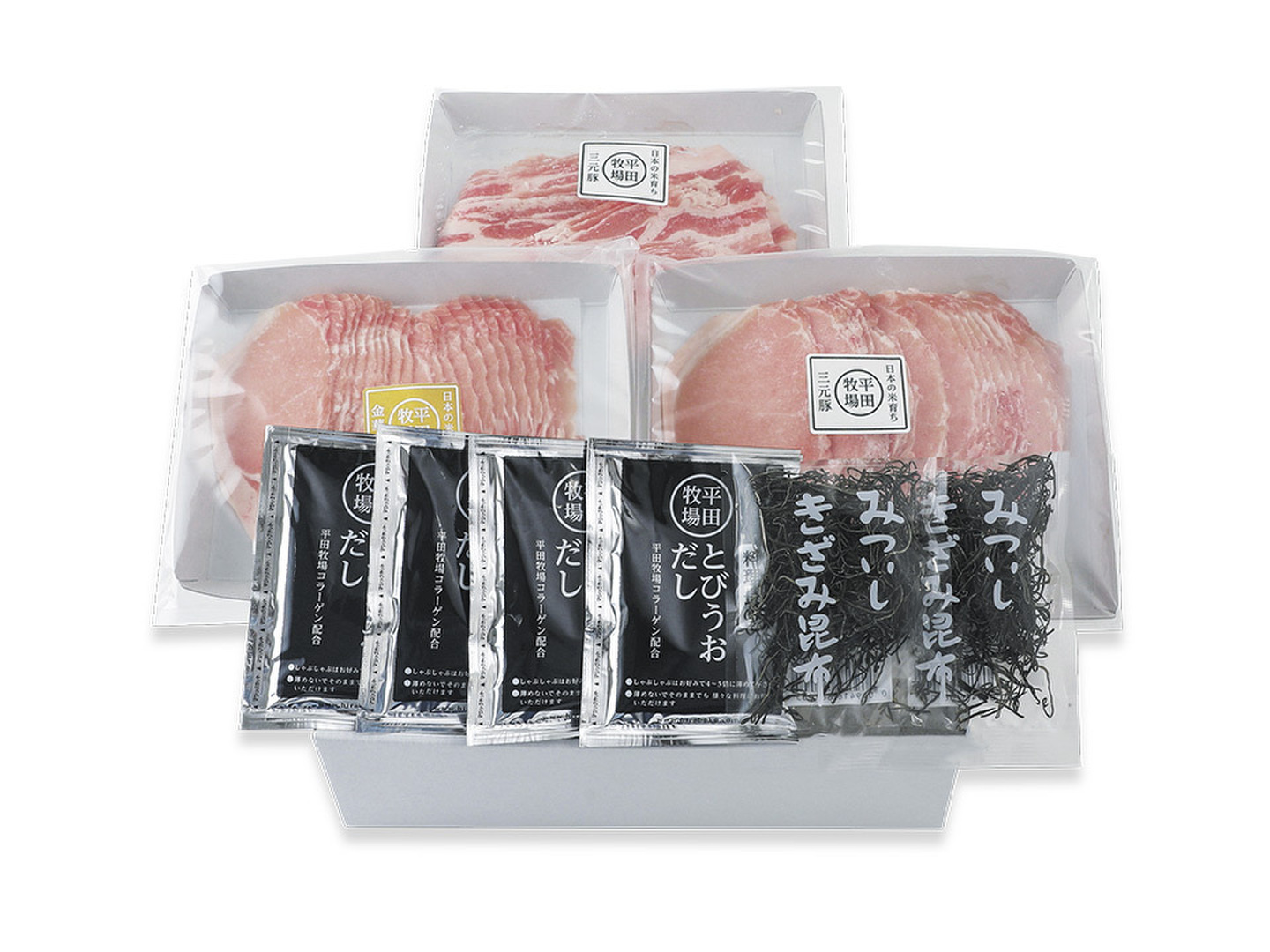 | 内容 | 日本の米育ち金華豚ロース (200g)×1個、日本の米育ち三元豚ロース (300g)×1個、日本の米育ち三元豚バラ (200g)×1個、とびうおだし (50ml)×4袋、きざみ昆布(10g)×2 | ||||||