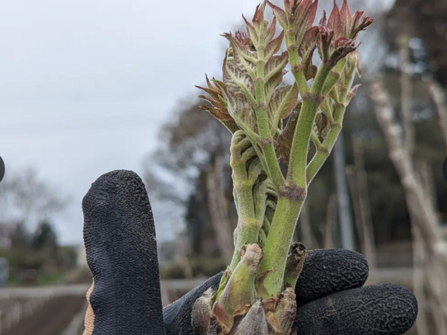 山ウドは緑の新芽の部分で抜群の風味があり美味しいです。きざんで厚焼き玉子に入れると苦味が効いて大人の味になります。