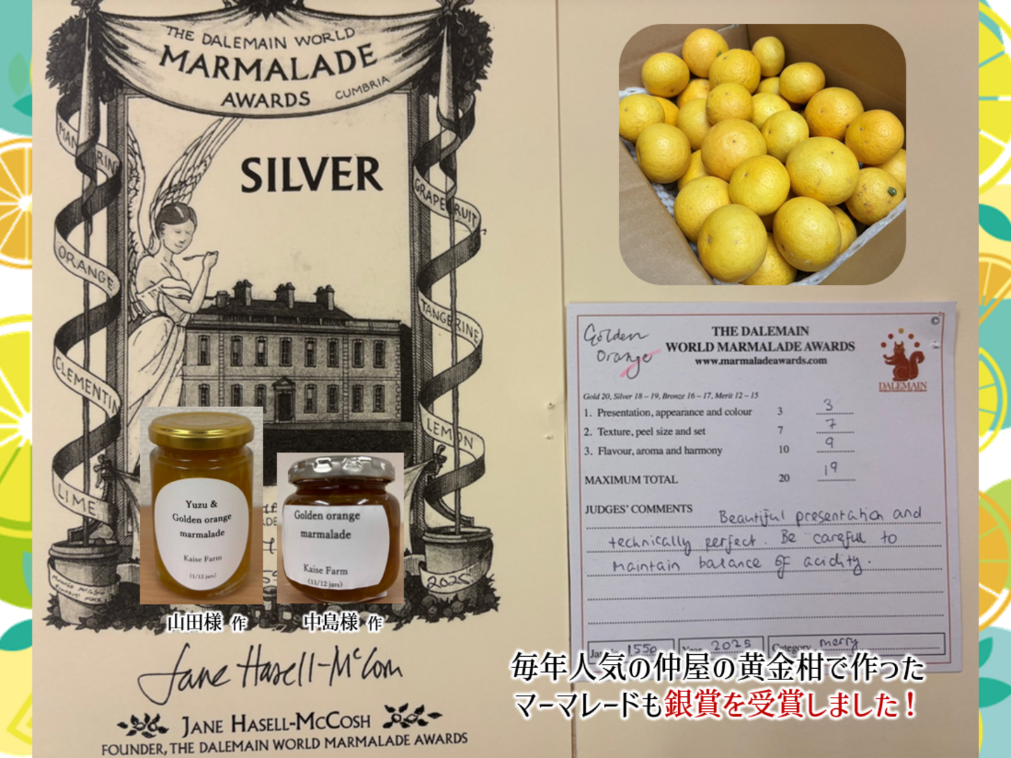 ★山田様が仲屋のれもんで作ったマーマレードが、イギリスで開催されたThe Dalemain World Marmalade Awards & Festivalのホームメイド部門で銀賞を受賞しました!
