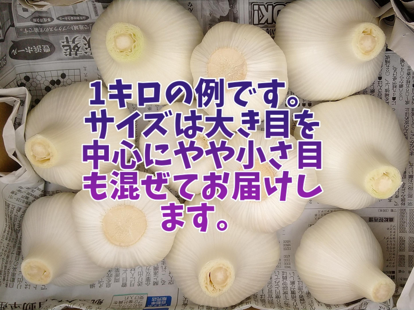 1箱(60サイズ)に、1キロ 8~14個ほど入っています。にんにくのサイズは、できるだけ大き目のものを選んでお届け予定ですが、収穫の状況により大小サイズ取り混ぜてお届けすることがございます、ご理解のほどよろしくお願いいたします。