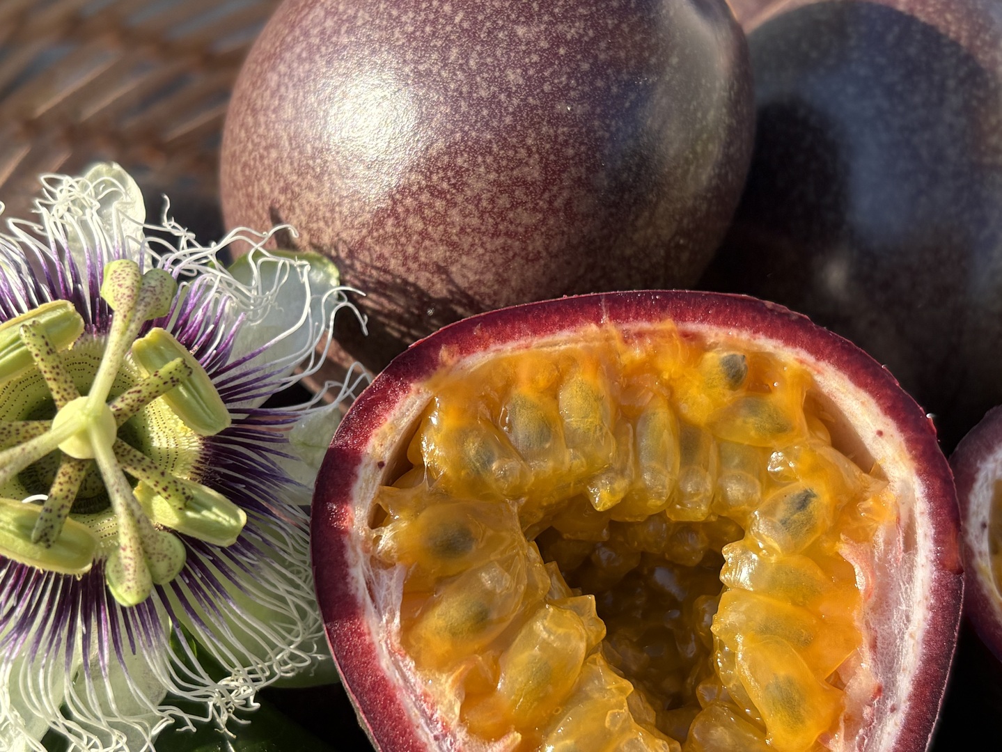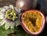 和名クダモノトケイソウ。紫色の外皮と中に詰まったゼリー状の黄色い果肉と種が特徴的です。