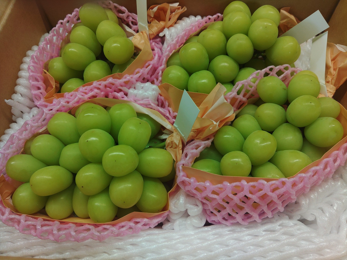 ※シャインマスカットは緑色の粒が特徴とされますが、完熟期の収穫となりますので、房や部分的に黄色味を帯びることがございますが、緑の粒でも黄色い粒でもしっかりと甘みがございますので、ご安心下さい!