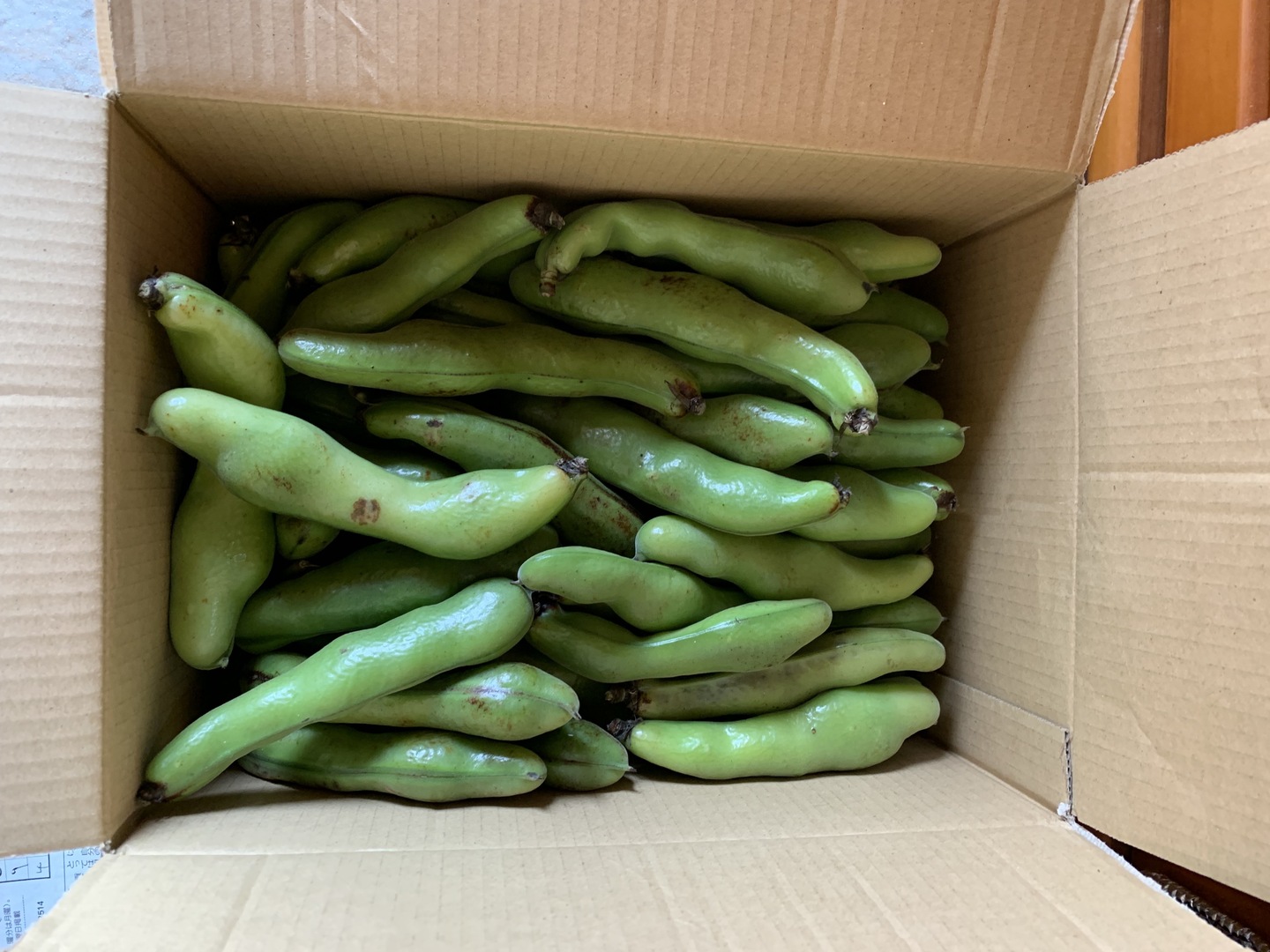 そら豆(お多福) 約60本 大きさ不揃い (そら豆の皮に黒い箇所有り 豆は異常なし)、(箱込み重さ 2.5Kg~3Kg))
