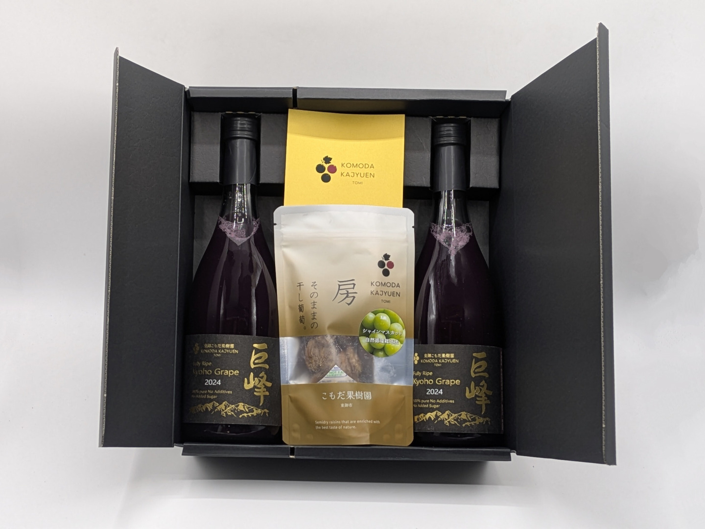 | 内容 | 巨峰ジュース720ml×2本、セミドライシャインマスカット(50g)×1個 | ||||||