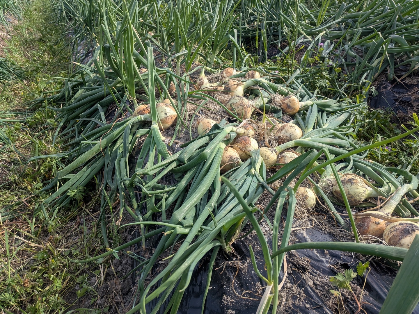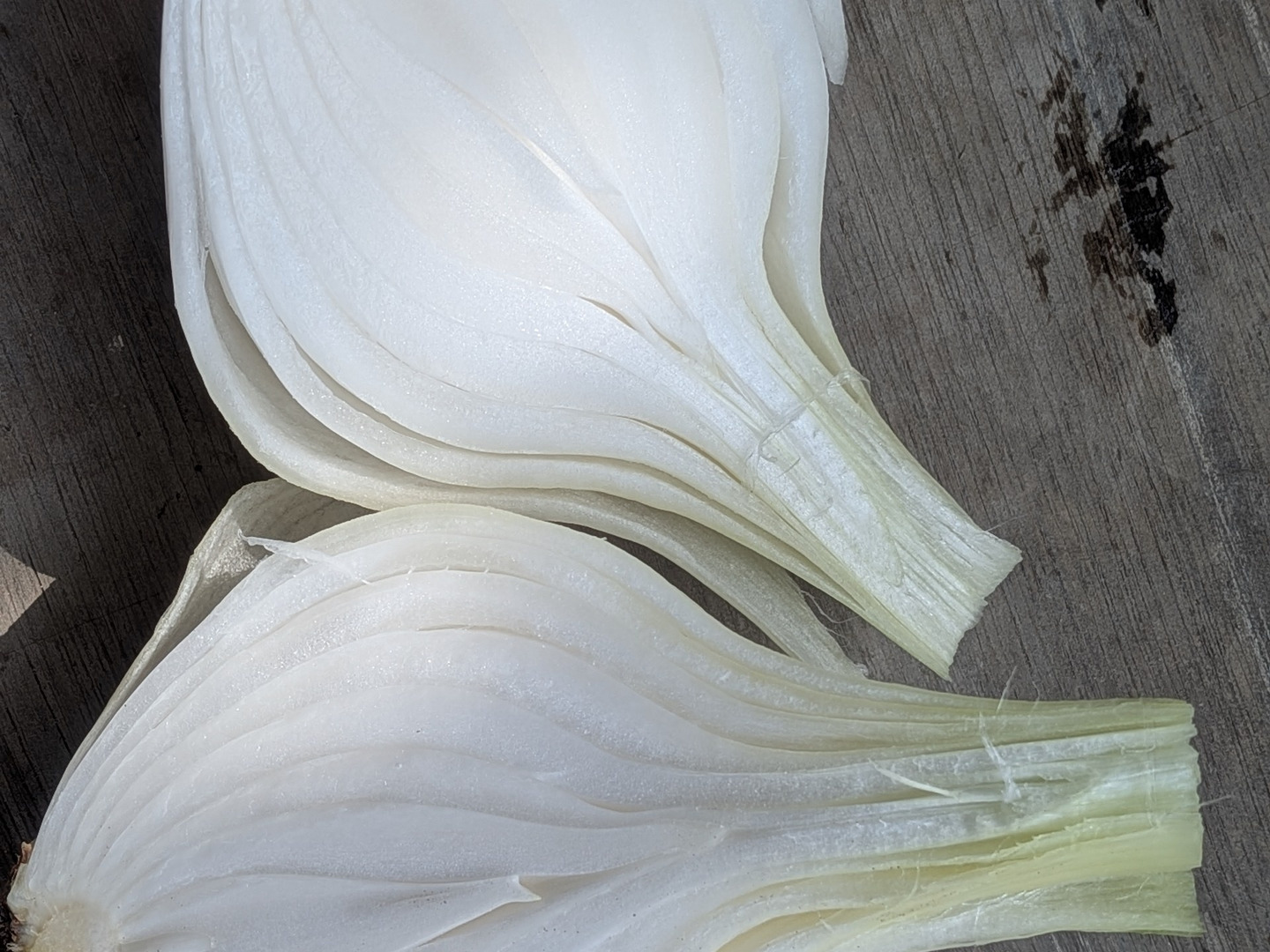 収穫後に一度皮を剥き、吊り下げ保存しています。その後出荷時に更にひと皮剥いてからの発送になります。写真の緑色の状態になります。緑色はケルセチンが豊富である証でもあります。