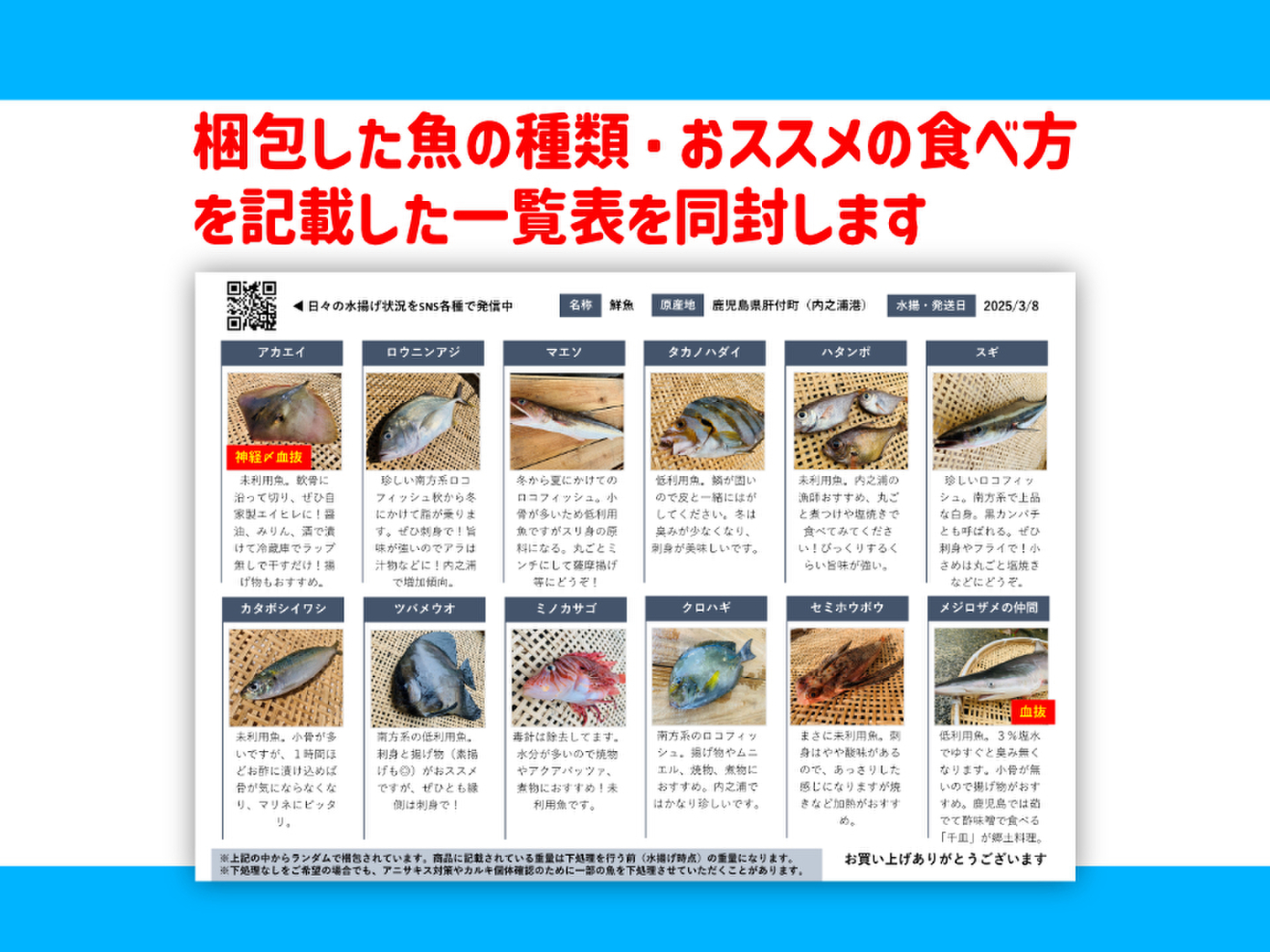 | 内容 | 鹿児島県肝付町内之浦産 鮮魚 2.5kg | ||||||