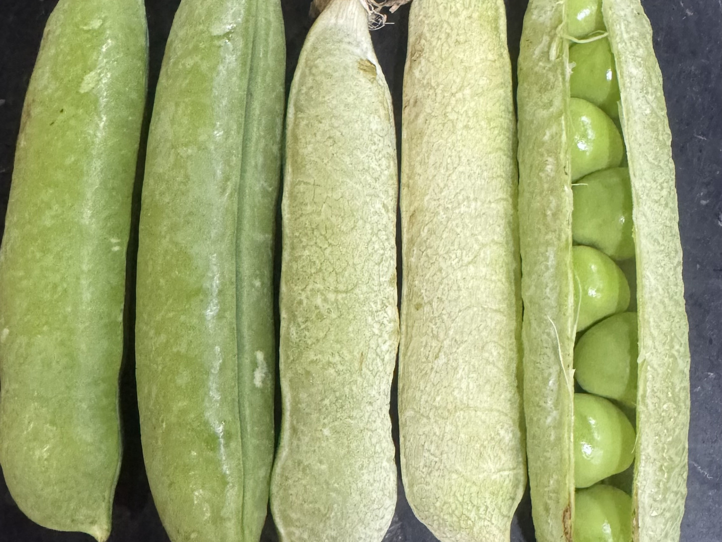 収穫終盤になり 莢が白っぽくなってしわが入っている物がほとんどになりますが、青いのも混ざっています。未熟のと比べて多少硬くなります。