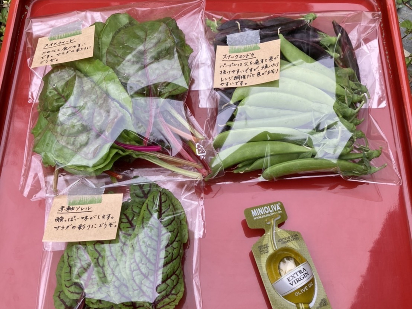 ミニサイズのオリーブオイル、別添えのお野菜もお付けしています。