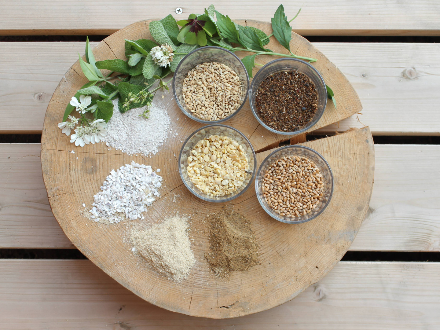また、自家農場産の野菜、小麦若葉、野草などをたっぷり食べています。