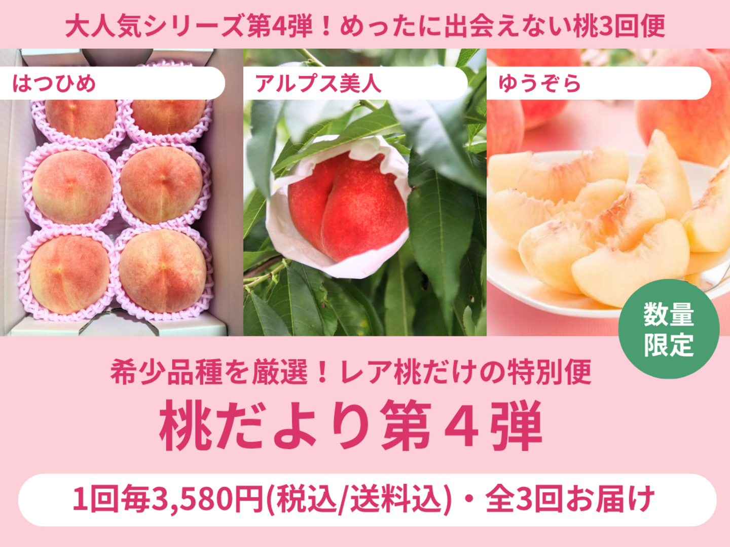 全国各地から厳選した美味しい桃を、7月上旬・7月下旬・8月に各1回1種類、お届けする定期便サービスです。