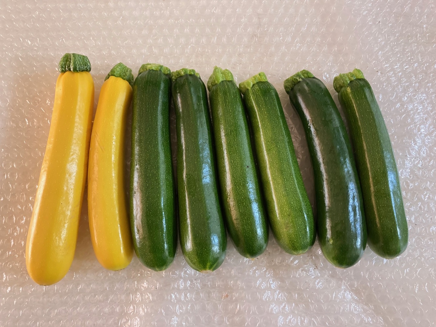 ご注文を頂いたときに収穫タイミングを迎えたズッキーニになりますので、緑色と黄色の入る割合はランダムになります。