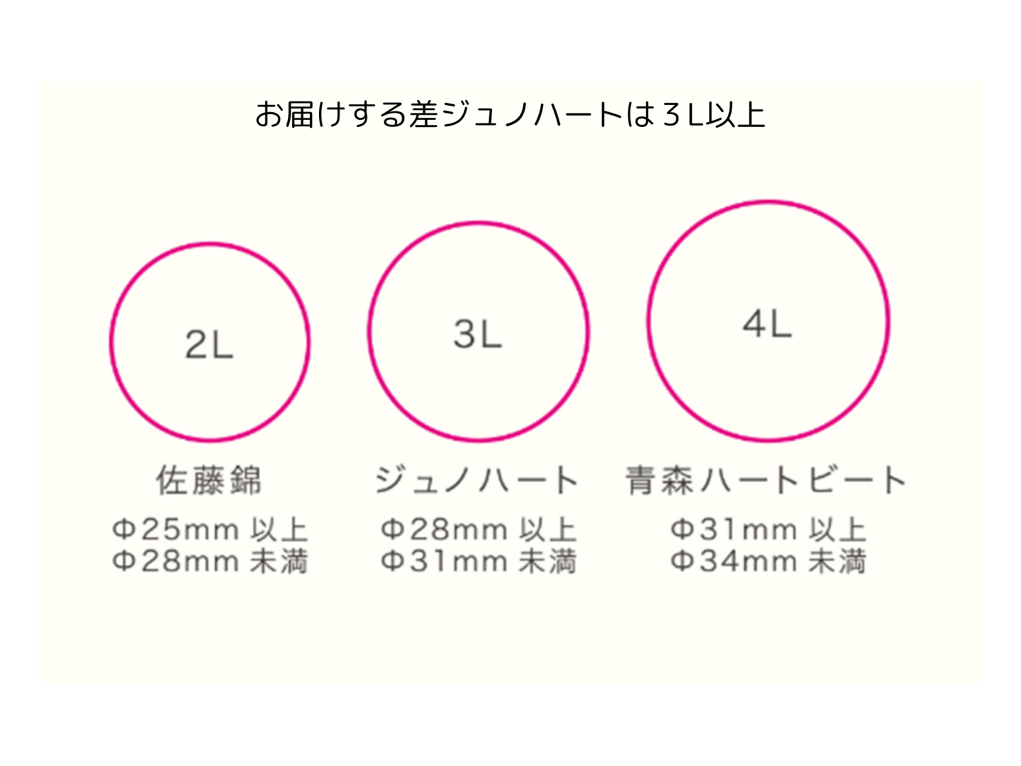 収穫のタイミングにもよりますが、4L、5Lの青森ハートビート相当のジュノハートが入ることもあります。