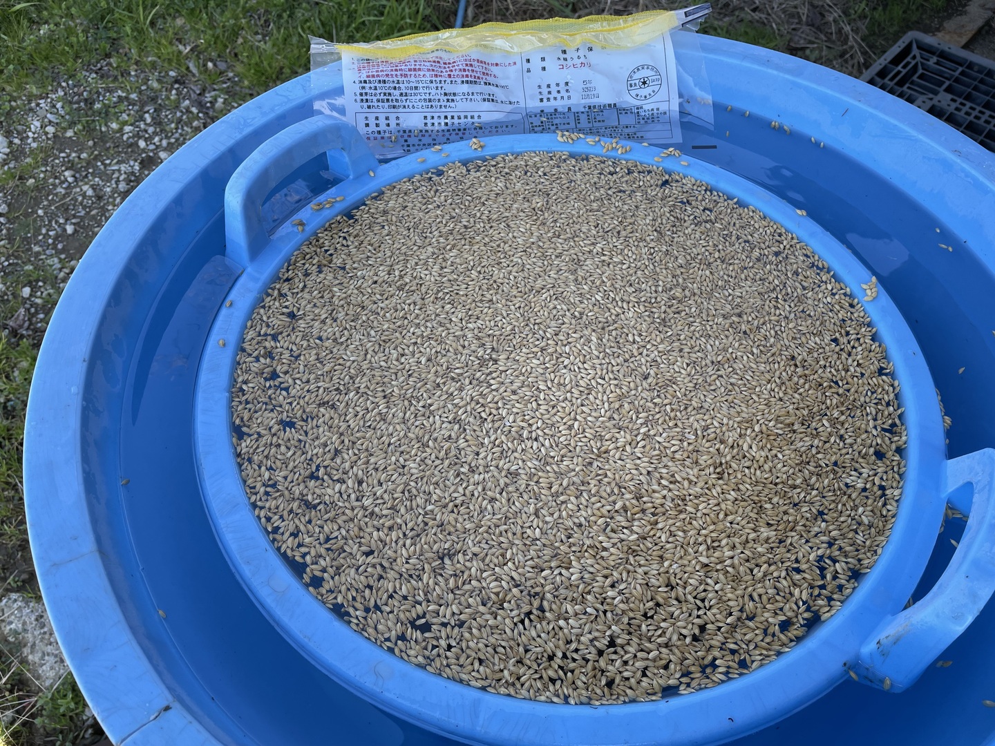 種子を厳選して苗づくりをしています (苗作りの前にJAより購入の種もみを塩水に入れて選別します。弊社ではこの塩分濃度を通常の1.5倍にし、約25%を取り除き優良な種のみで苗を育てます。写真にあるのは優良でない種が浮いている様子で、下に沈んでいる比重の高い種のみを使用します。)大多喜町産コシヒカリは食味はとても良いです