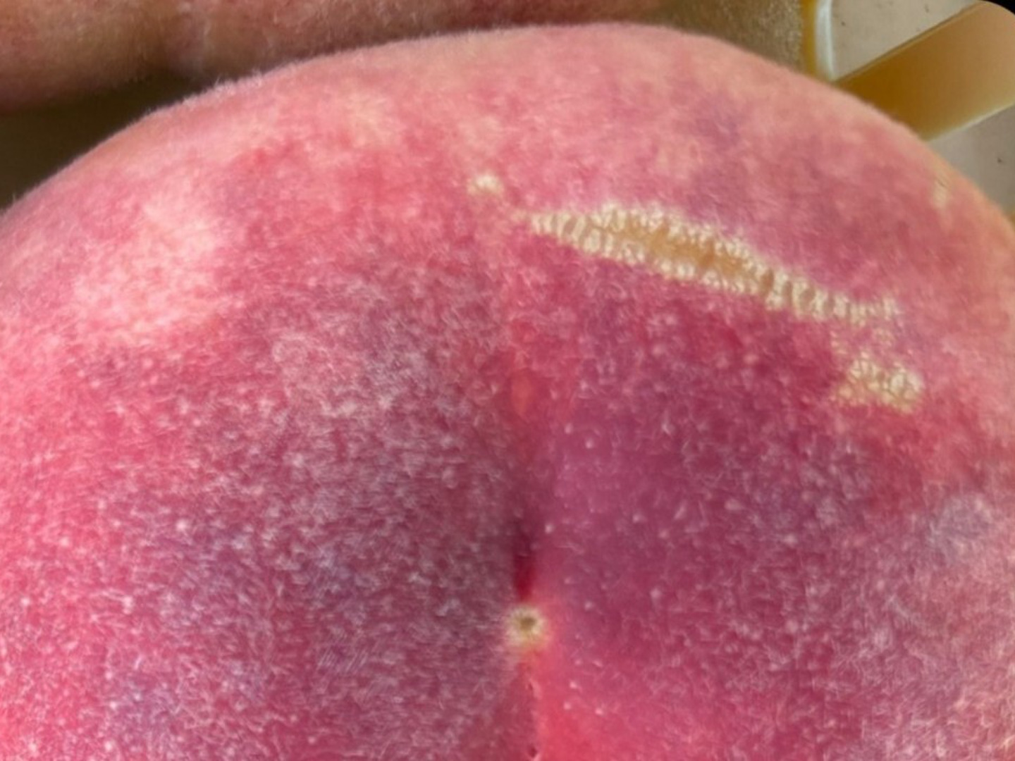 ・枝おさえによる変色、傷、変形、着色不良、白っこ(頭頂部が白い)等のある桃です。