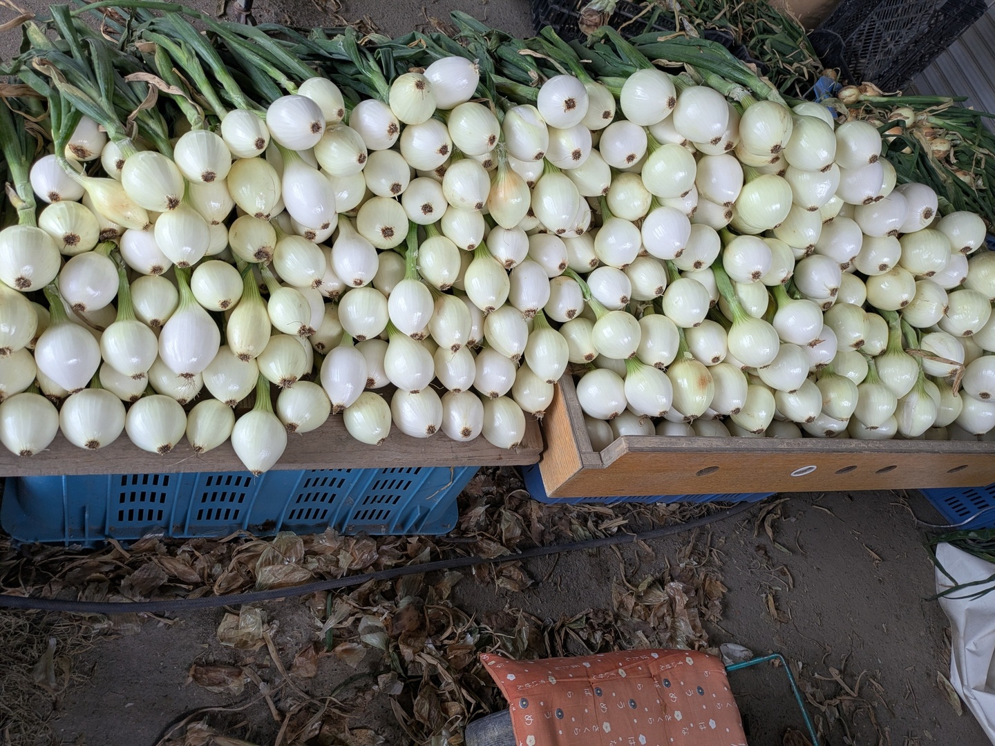 収穫後に一度皮を剥き、吊り下げ保存しています。その後出荷時に更にひと皮剥いてからの発送になります。写真の緑色の状態になります。