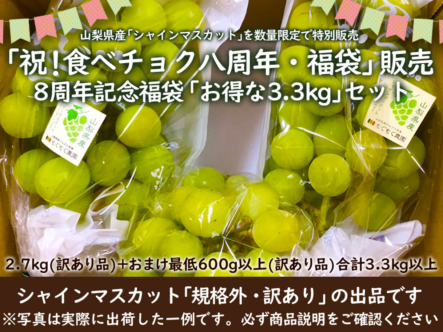 さらに…8周年を記念して!さらにお得な3.3kg以上を詰めたシャインマスカットを8888円で販売いたします!