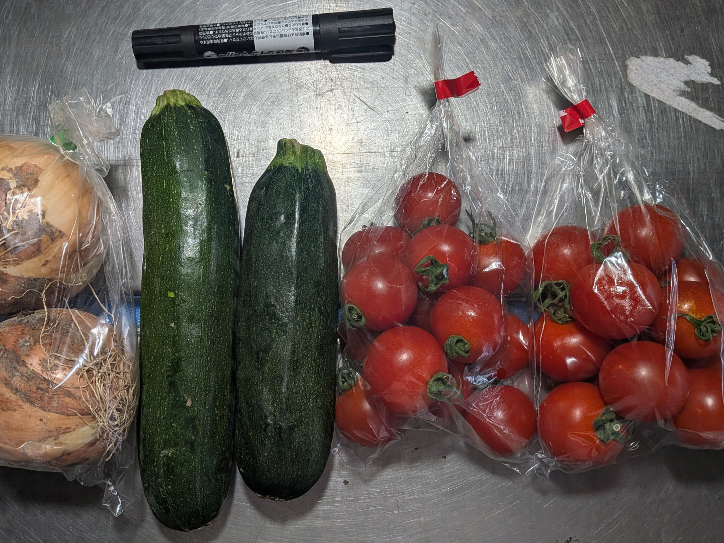 桃1.4kg、ズッキーニ500g、トマト700g、タマネギ500gの詰め合わせです。