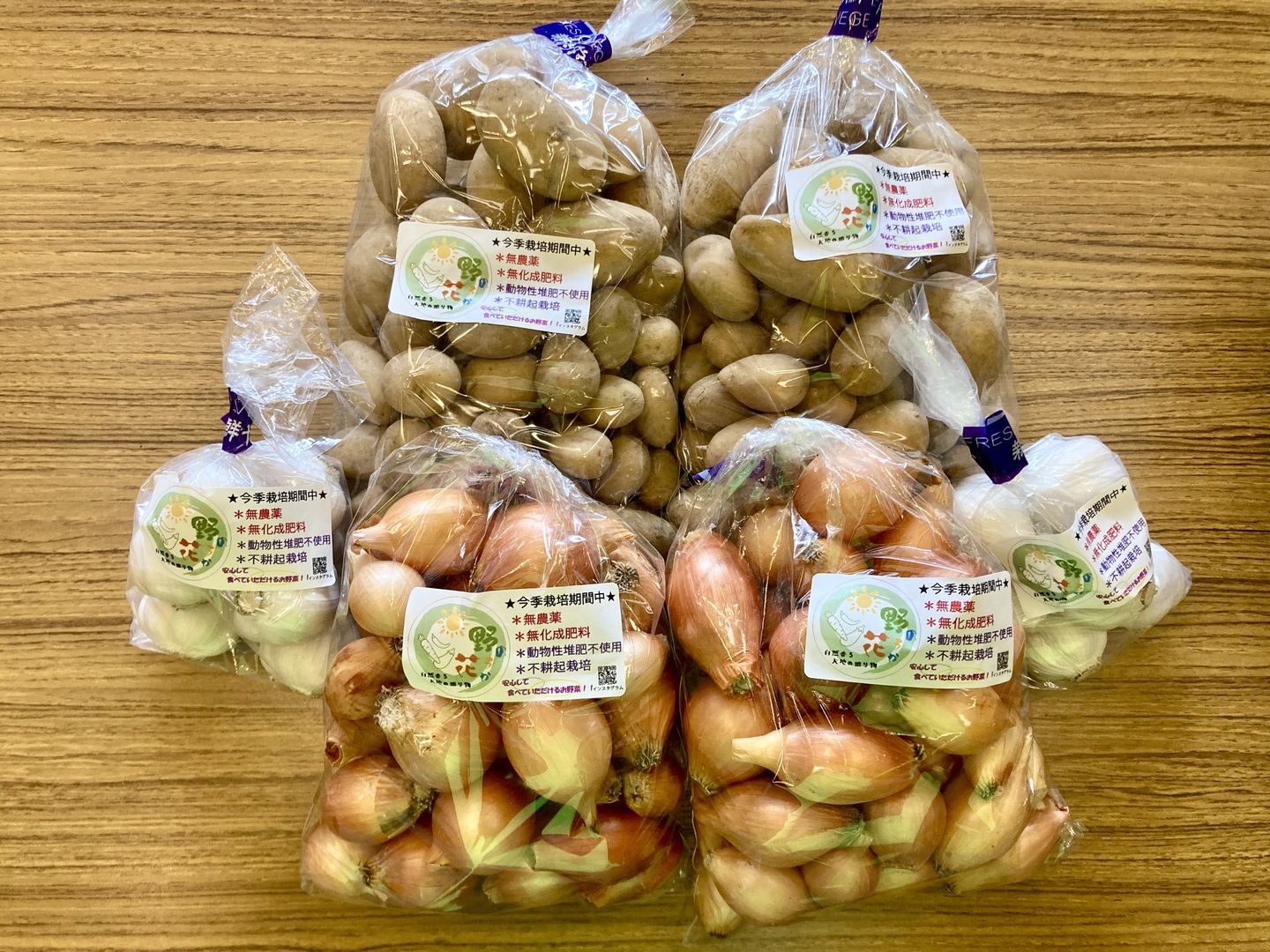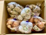 玉ねぎ(シャルム・400g×2袋)、ジャガイモ(メークイン・500g×2袋)、ニンニク(ホワイト6片・7個×2袋)の、小粒ばかりを一箱限定で販売します!!