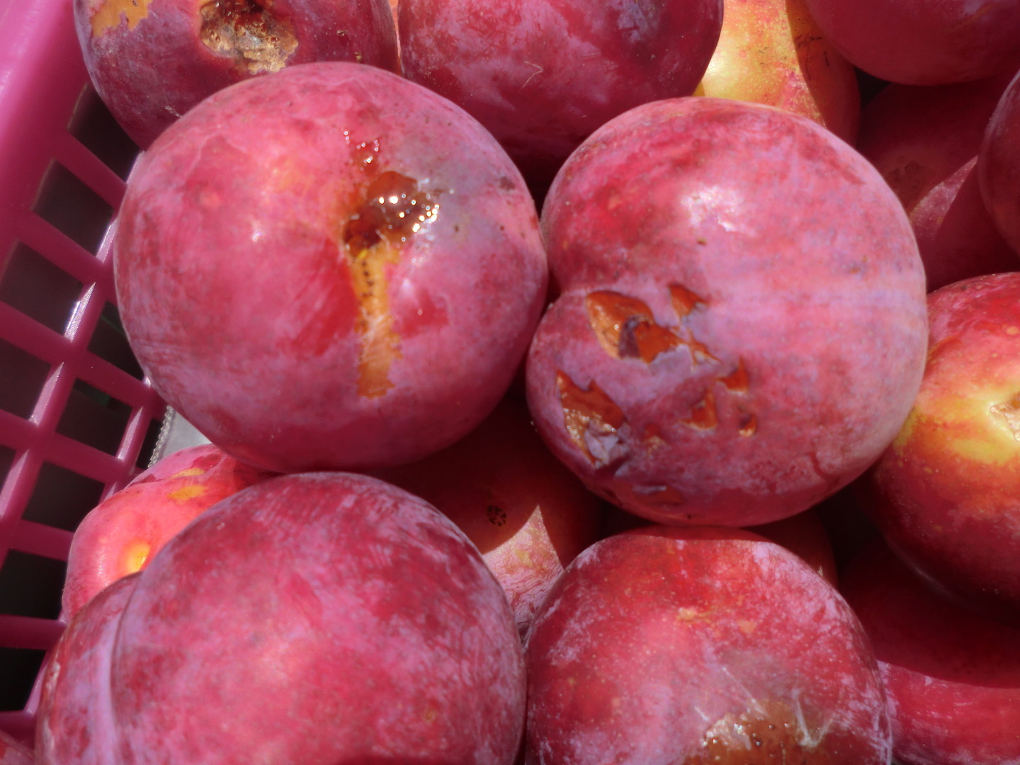 今年は梅雨明け後の収穫となってしまい、農薬を使わないため害虫に吸われたり、皮を薄く食べられたりとB品(訳あり傷物)がとても多くなってしまいました。