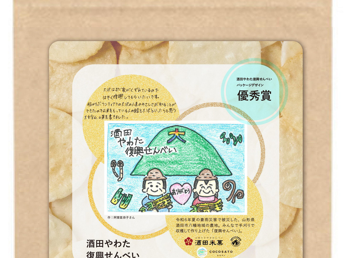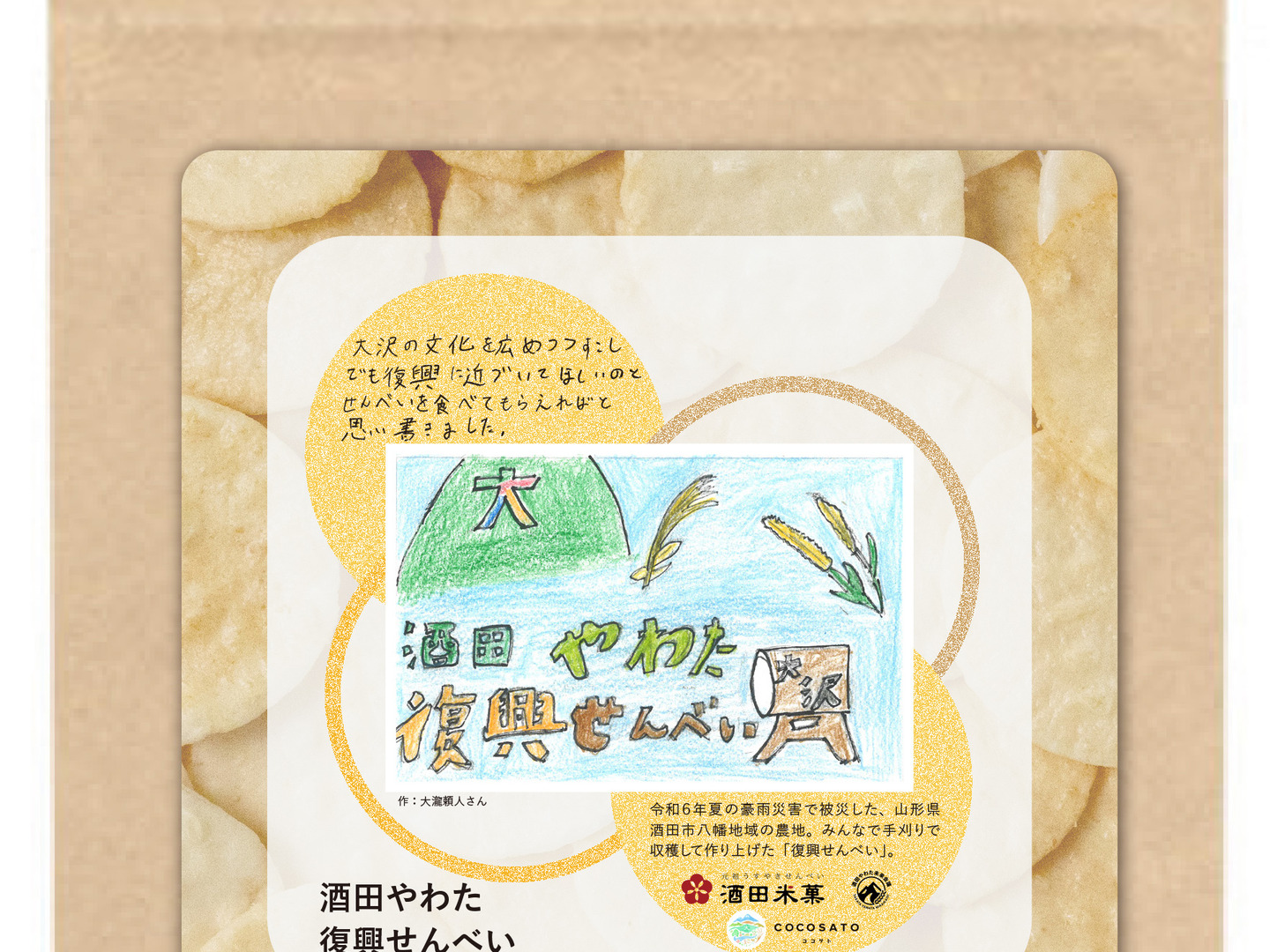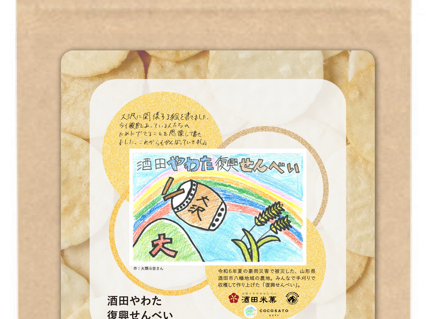 合同会社COCOSATOが企画・販売、酒田米菓株式会社 様が製造、酒田やわた未来会議がデザイン監修をし、開発しました。デザイナーは東北芸術工科大学卒業生の高橋睦丸氏が担当。塩味には、株式会社さかたの塩 様の「さかたの塩×アイアイひらたの塩」のW塩を使用。お米の籾摺りで株式会社アグレスト様にご協力いただきました。