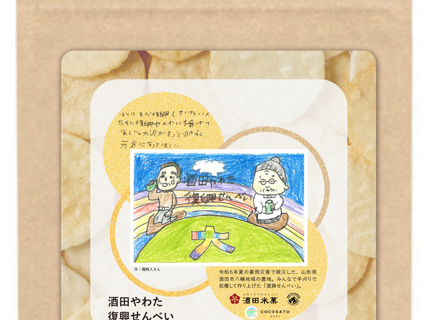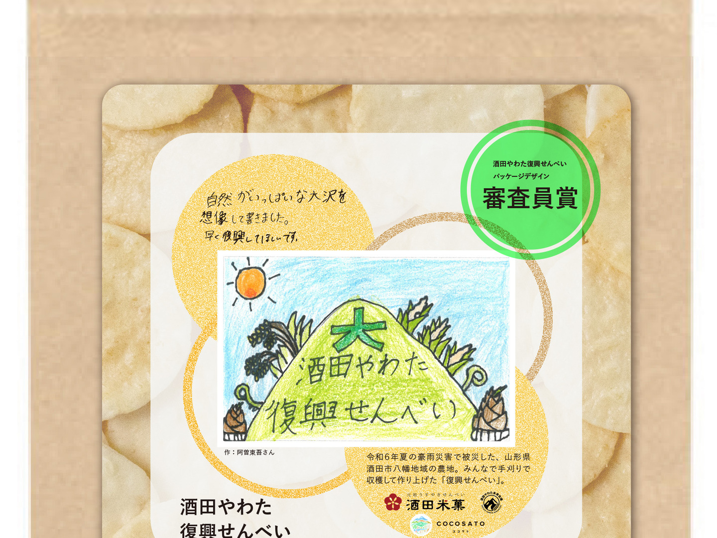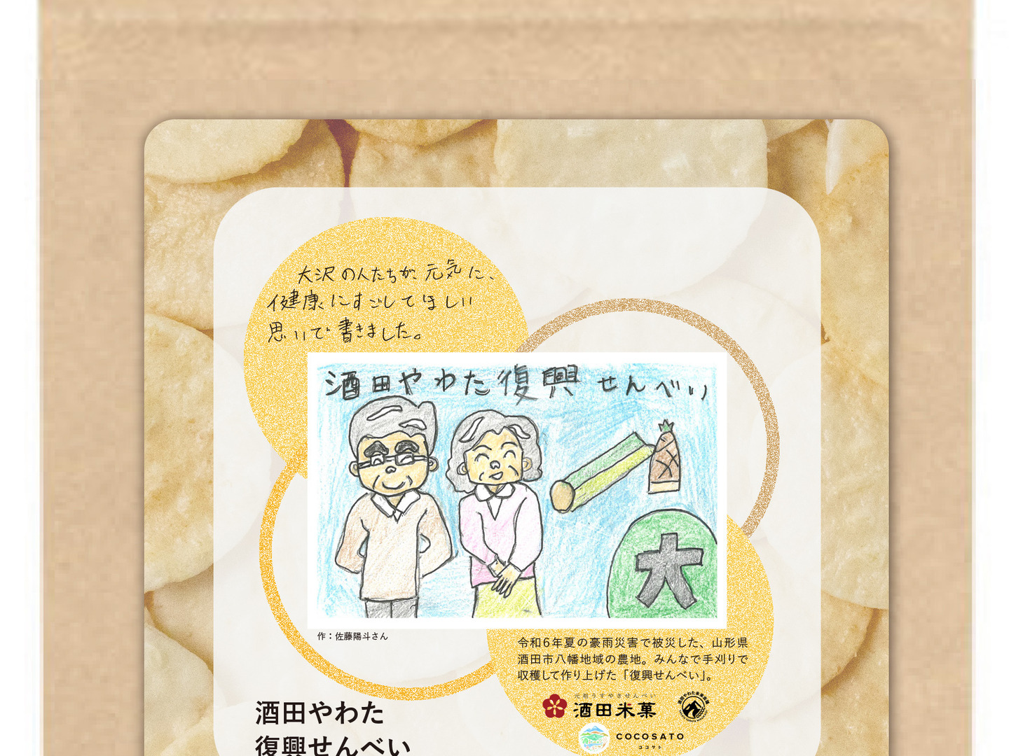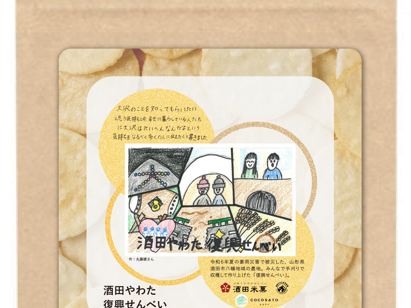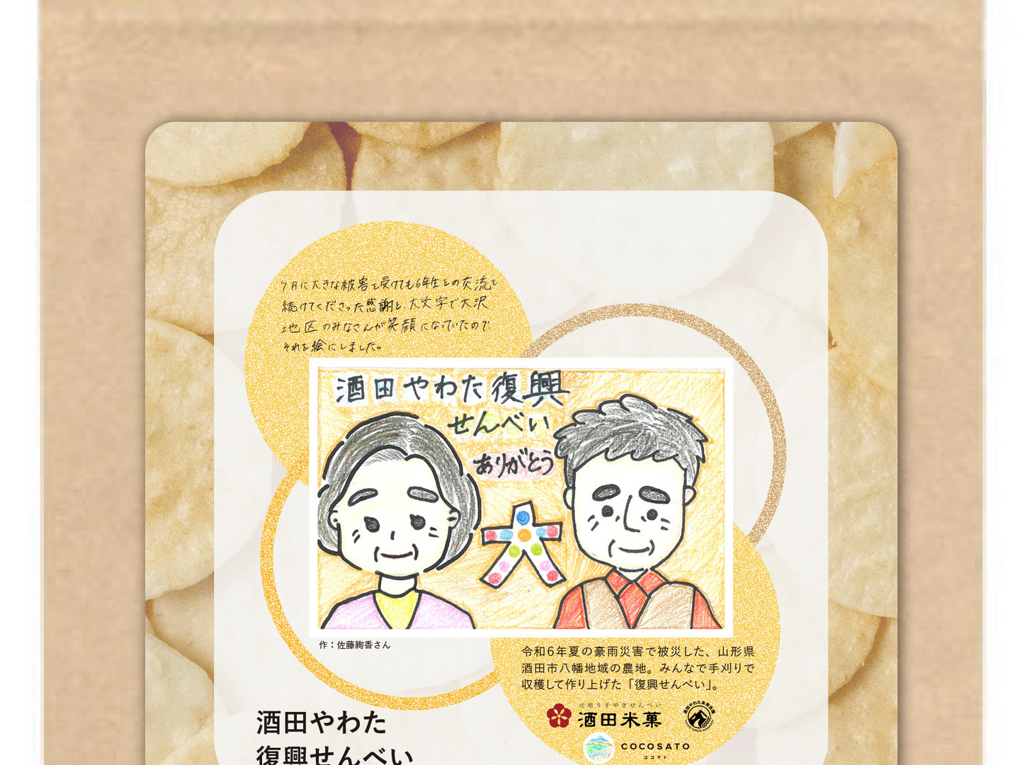 合同会社COCOSATOが企画・販売、酒田米菓株式会社 様が製造、酒田やわた未来会議がデザイン監修をし、開発しました。デザイナーは東北芸術工科大学卒業生の高橋睦丸氏が担当。塩味には、株式会社さかたの塩 様の「さかたの塩×アイアイひらたの塩」のW塩を使用。お米の籾摺りで株式会社アグレスト様にご協力いただきました。