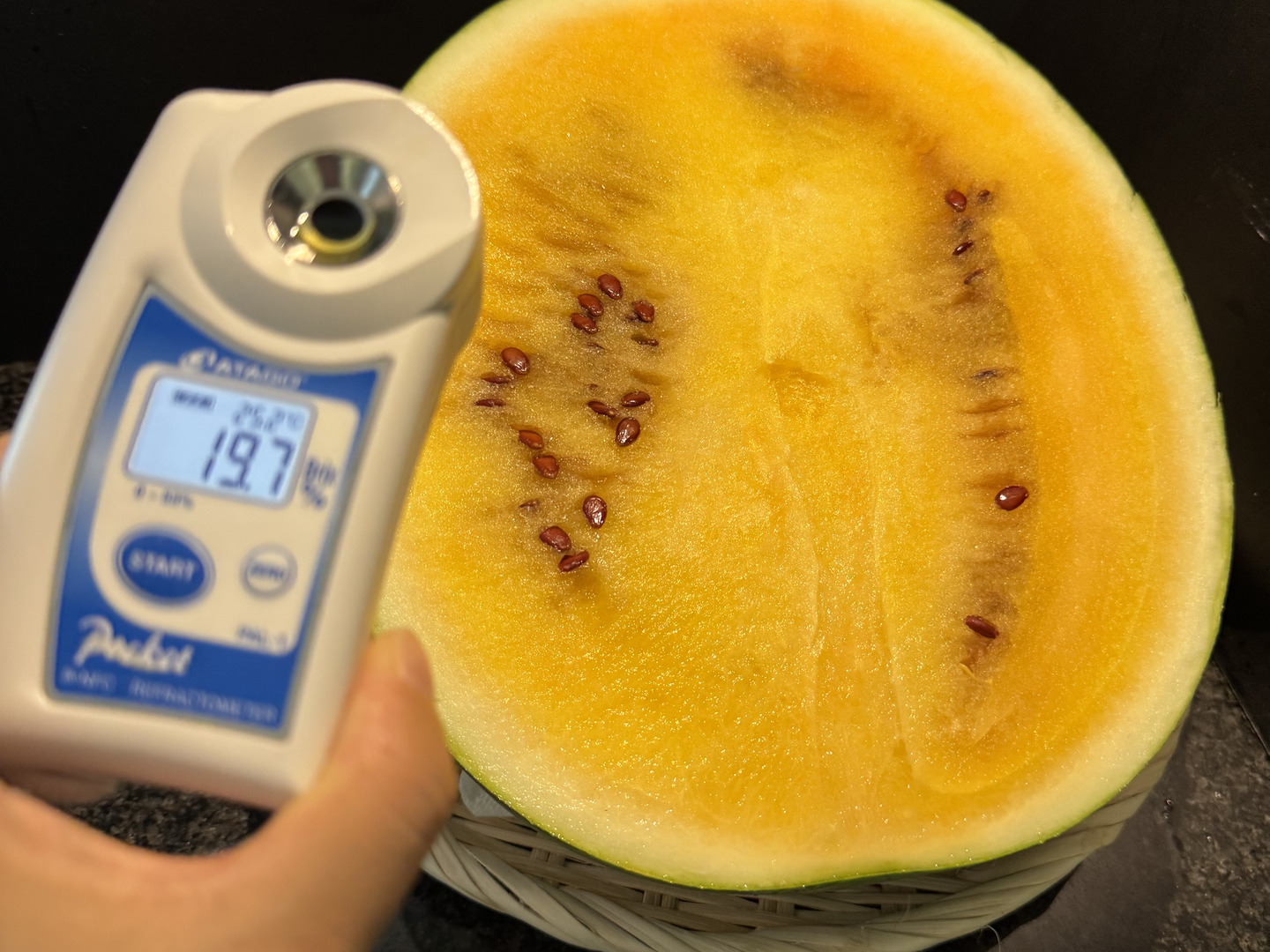 中身が黄色の高糖度スイカ、赤茶色の種は高級品の象徴。赤肉よりも長持ちしやく、切って3日後でも4日後でも変わらず美味しいです。