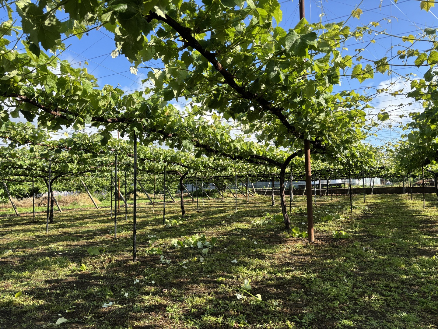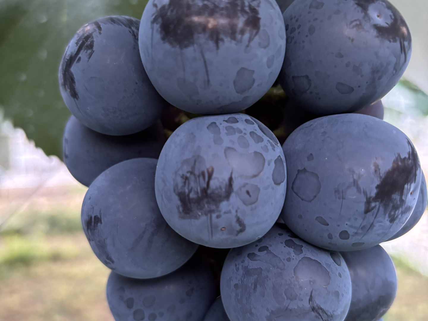 その最大の特徴は粒の大きさで、大きいものはゴルフボールほどもあります。また、とても甘く、まさに黒色ぶどうの王様です。