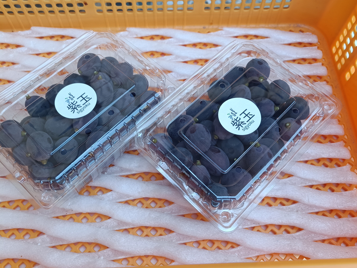 紫玉は早生巨峰とも呼ばれ、その名のとおり巨峰より早く収穫出来る品種で当園でも一番最初に収穫できる品種です。そして私自身が惚れ込んだ自信を持ってオススメできる品種でもあります!しかしながら栽培している農家さんが少ないため一般のスーパーなどに出回ることはあまり無くあまり知られていません。
