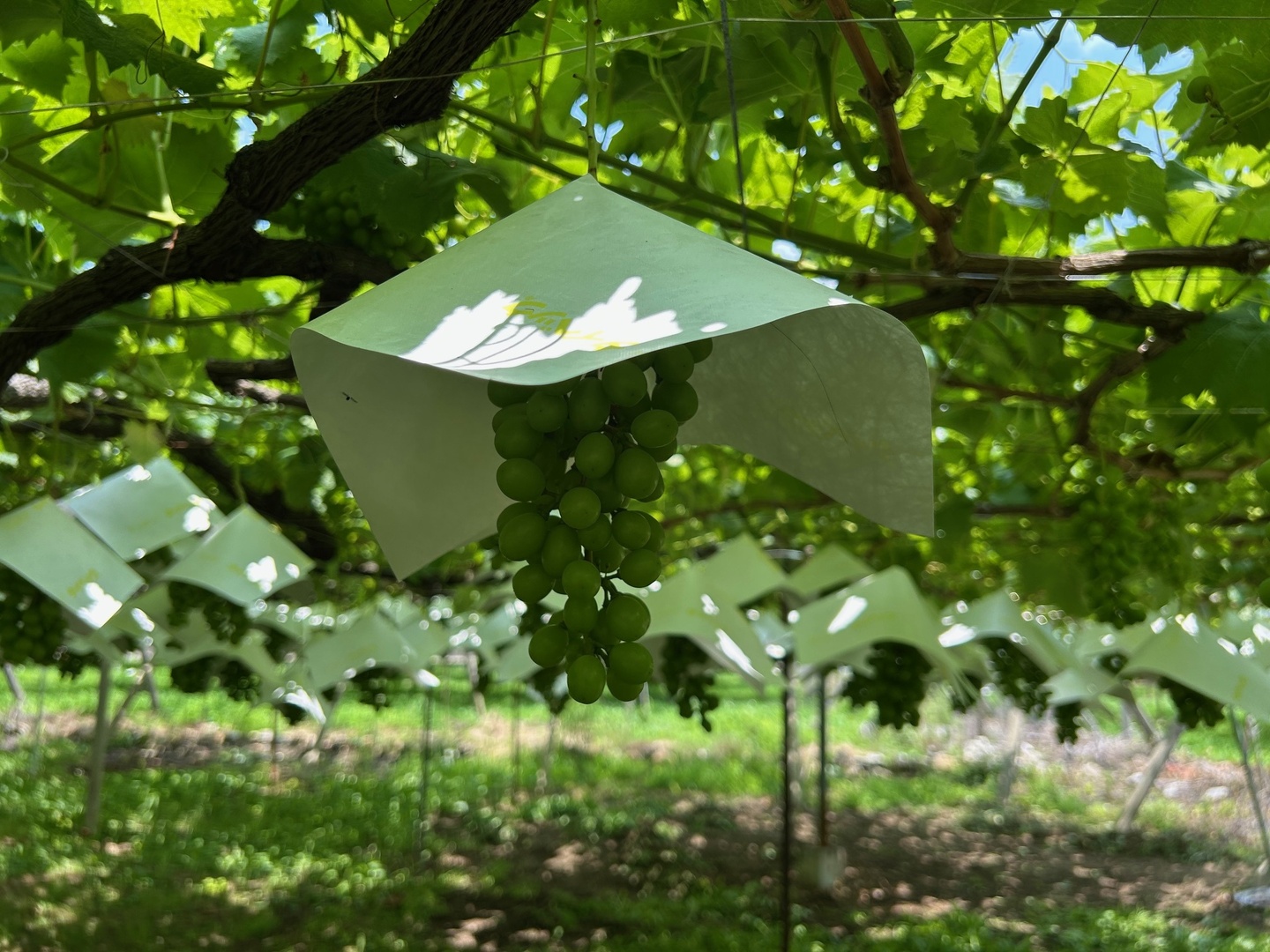当施設の畑で栽培したシャインマスカットを味わってもらってます。