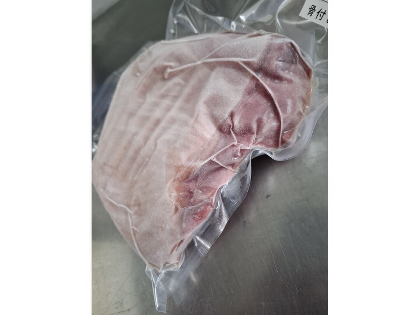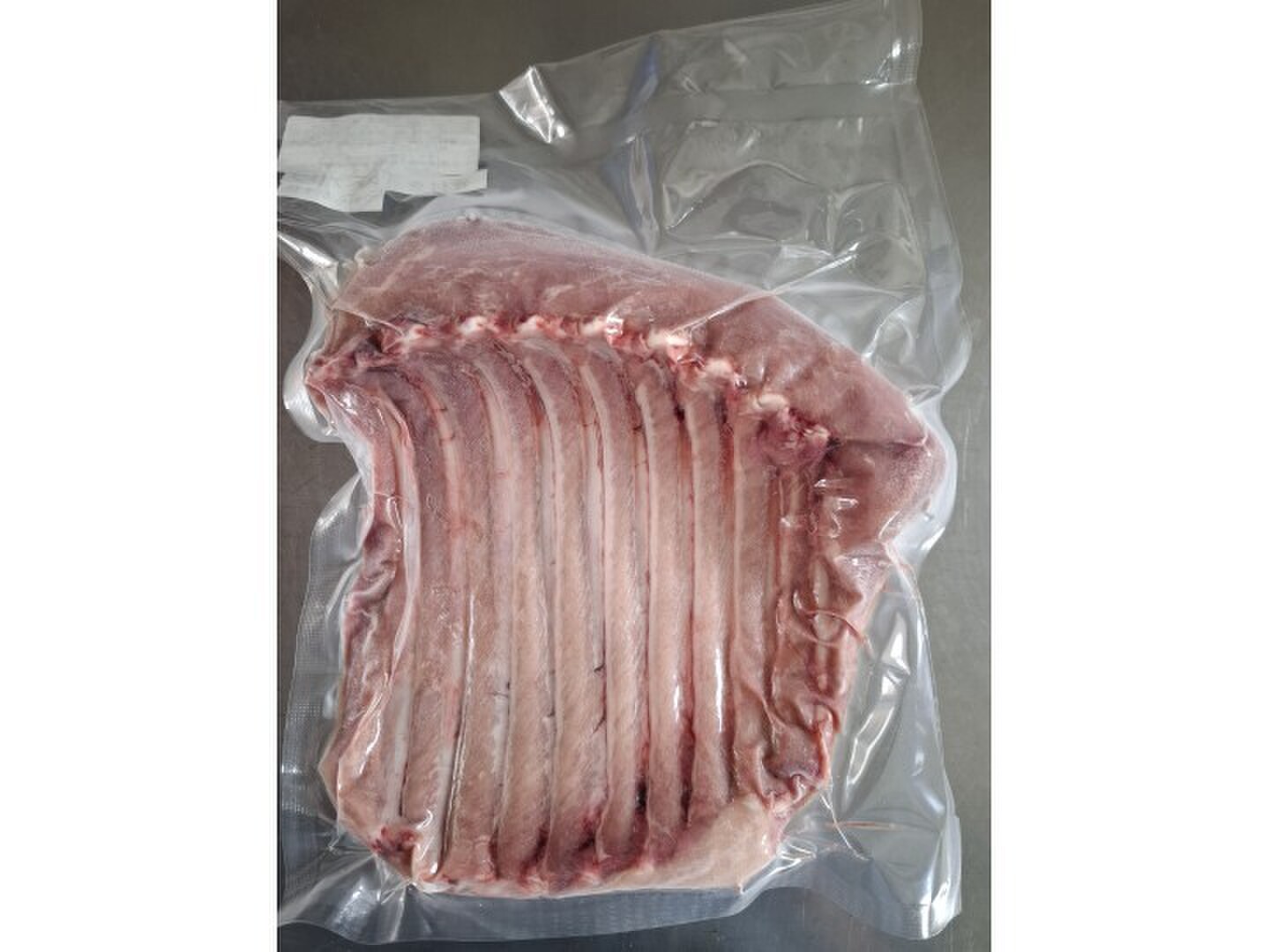 あばら骨が付いたスペアリブブロックです。あばら骨の間を切り離し、何本かに分けてから調理することもできます。