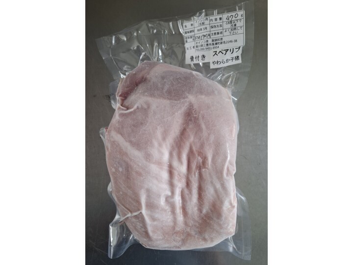 あばら骨が付いたスペアリブブロックです。あばら骨の間を切り離し、何本かに分けてから調理することもできます。