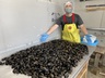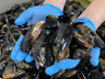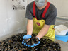 牡蠣養殖のロープや浮樽に自然に付着して育った天然のムール貝を丁寧に採取しました。