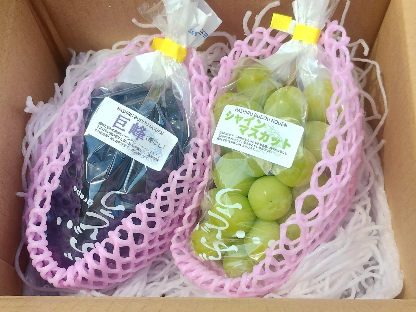 昨年は「袋から出した途端に粒が取れてしまった」というご意見を多くいただきました。これは巨峰が持つ“完熟すると脱粒しやすい”という特性と、当園が「ぎりぎりまで完熟させた巨峰」をお届けしていることによるものです。