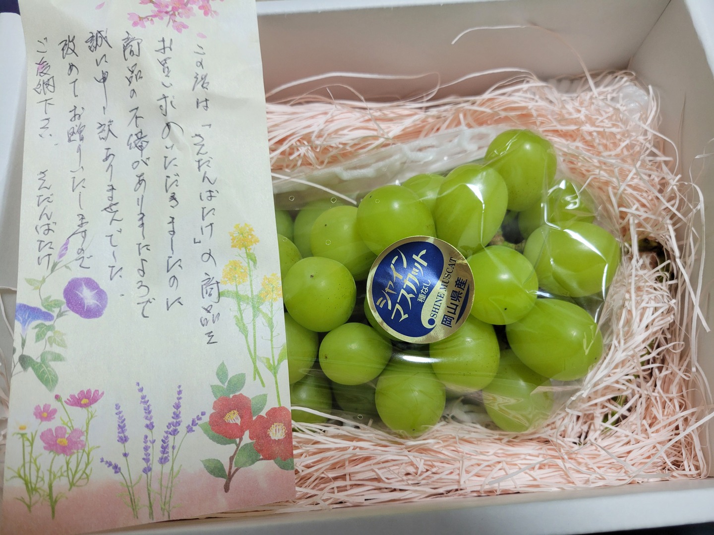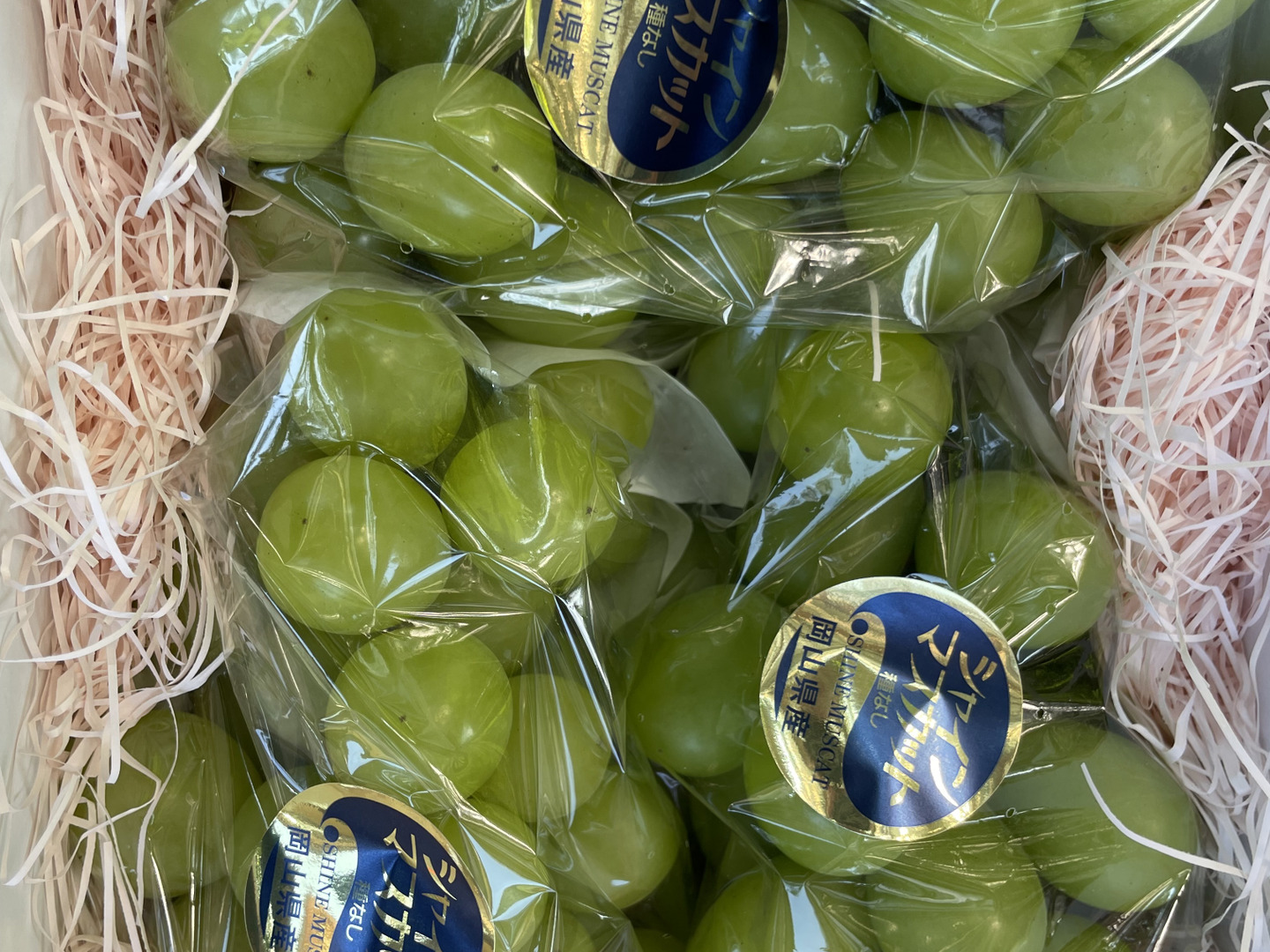 いよいよ、さんだんばたけ農園ではシャインマスカット収穫を行っていきます。今年は少々小粒もまじっていますが、甘さと爽やかさが魅力でおいしいです。1房500g前後で合計1.5kgです。味は甘味も爽やかさも申し分ありません。この企画が、最後の食べチョク様での販売になります。是非ご堪能ください。