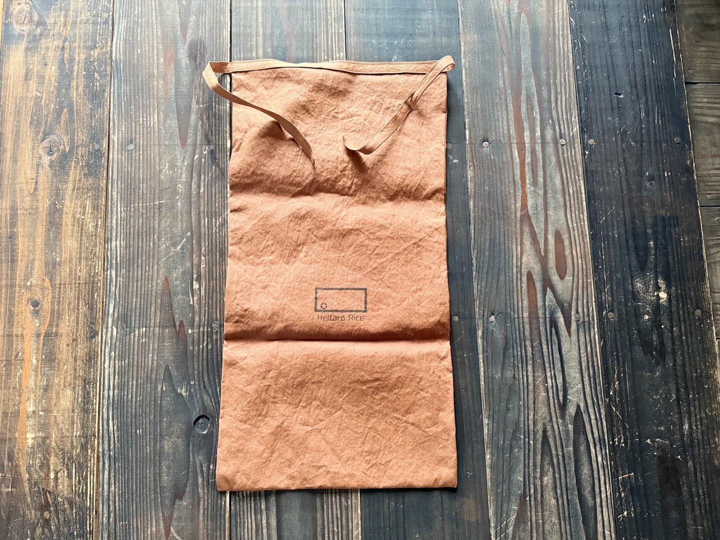 日本製のオーガニックコットンを天然染料である、柿渋染したお米袋に入れて、亀の尾『Heitarō Rice』として販売いたします。