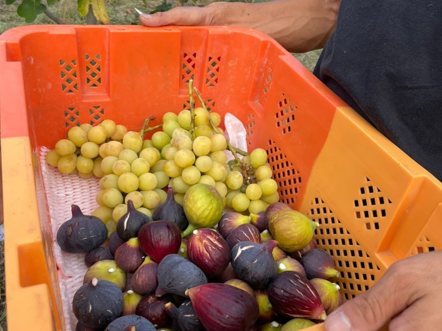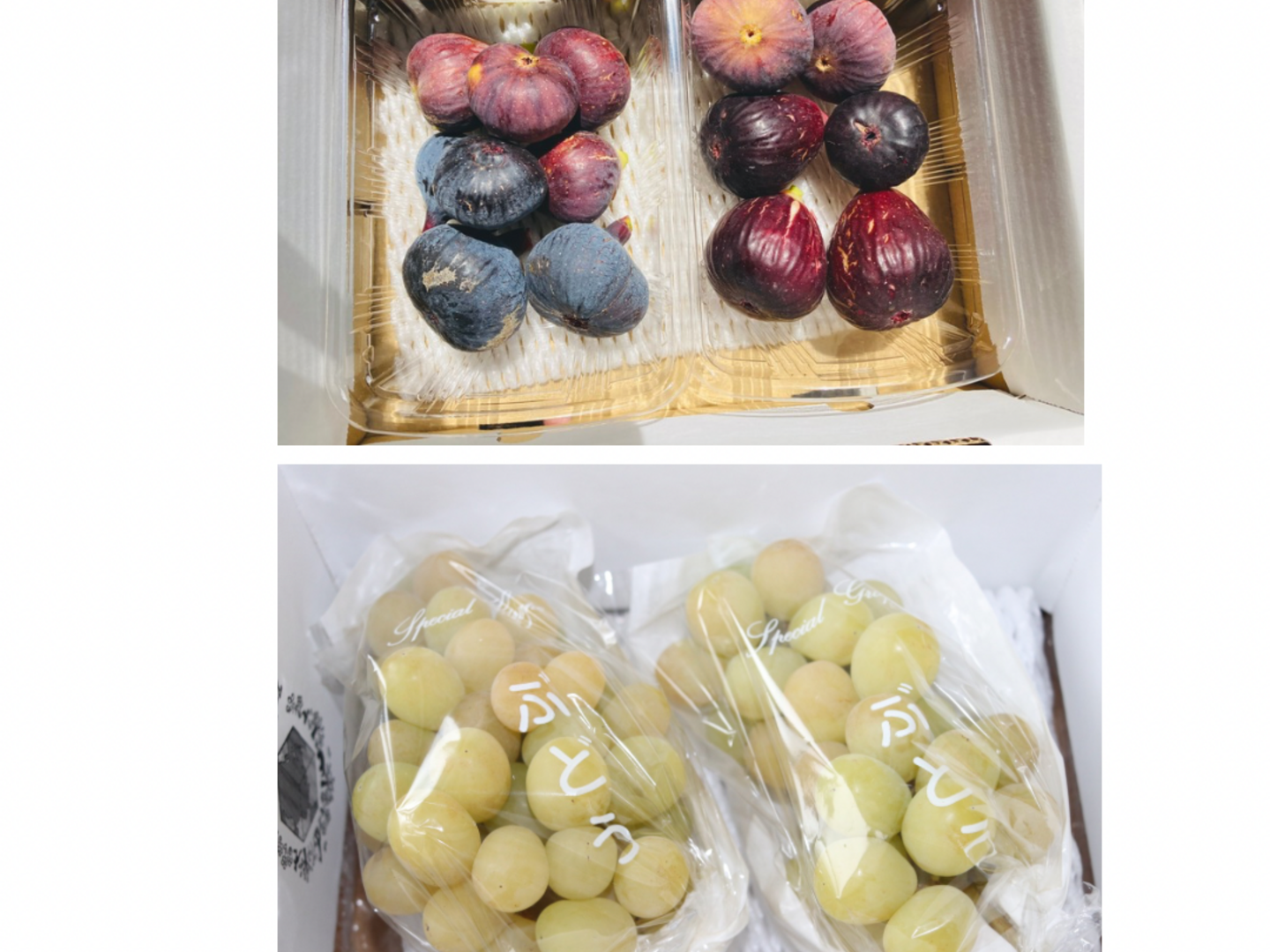 ひなた農園の農薬不使用いちじく2パック(約600g入り)と樹上完熟農薬節減シャインマスカット2房(約700g入り)を詰め合わせて発送します。