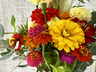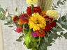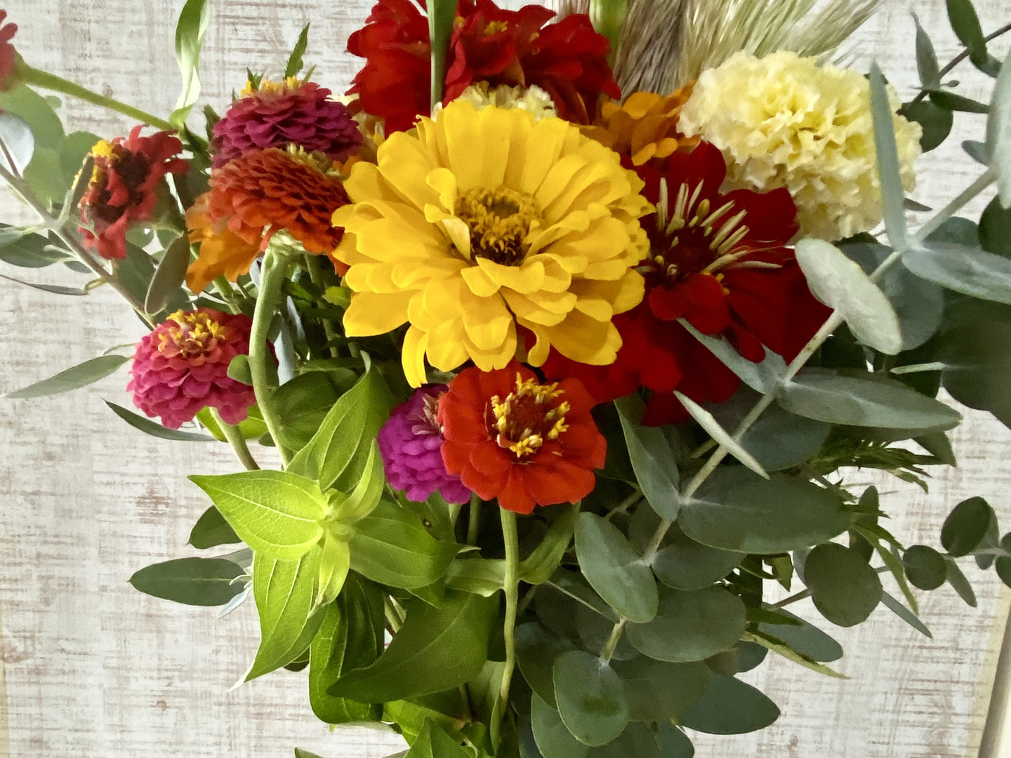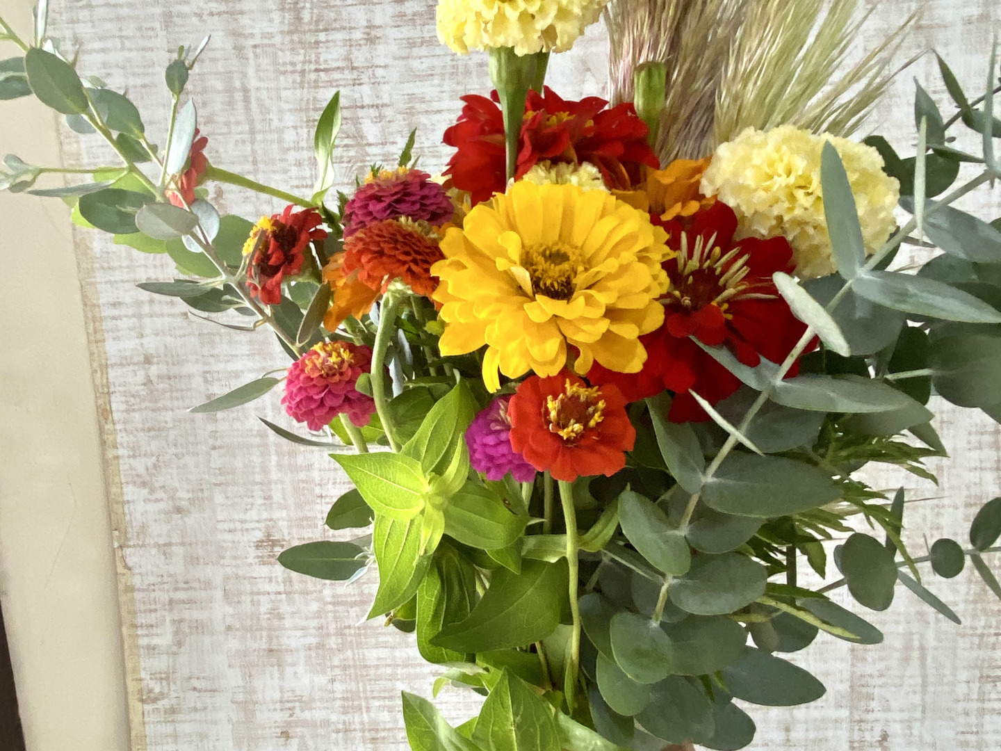 いろいろな鳥のさえずりが聞こえる田舎のフラワーガーデンから、元気いっぱいのお花を収穫してお届けします。パンパスグラスをアクセントに使いながら、カラフルで元気いっぱいの花々を合わせた「ナチュラル × ビビッド」スタイルに仕上がっています。夏から秋にかけて赤・オレンジ・黄色・ピンクで彩り豊かに元気に咲くジニアや、まんまるのややさしいクリームイエローのマリーゴールドとナチュラルなふわりとした穂が動きのパンパスグラスをプラスして、見る人を笑顔にする明るく華やかなブーケです。シルバーグリーンのユーカリが加わることで、ブーケ全体がぐっと洗練された表情に、お部屋に飾ればインテリアのアクセントに、贈り物にもおすすめです。