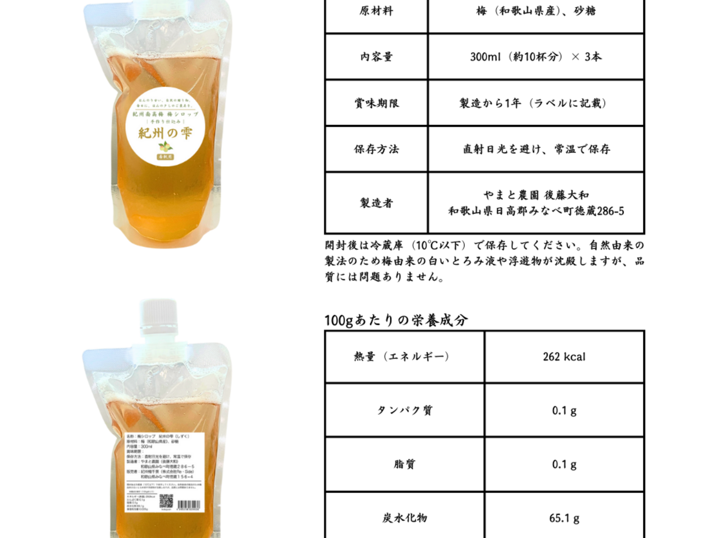 紀州南高梅 無添加 梅シロップ【紀州の雫】 やまと農園(和歌山県みなべ町) 300ml×3本