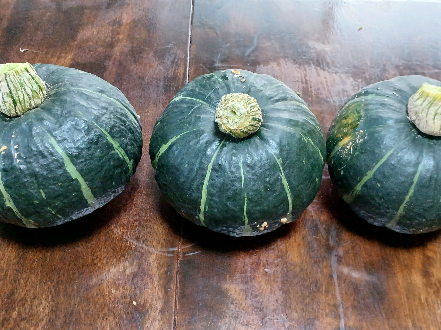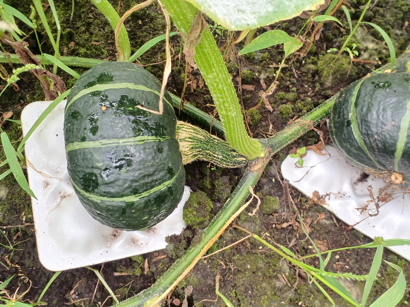 天候不順等により、小さめのトウモロコシもあります。ミニカボチャも、大小混在となります。また、地面に接している部分に日が当たらず、緑色に色付かない物もあります。