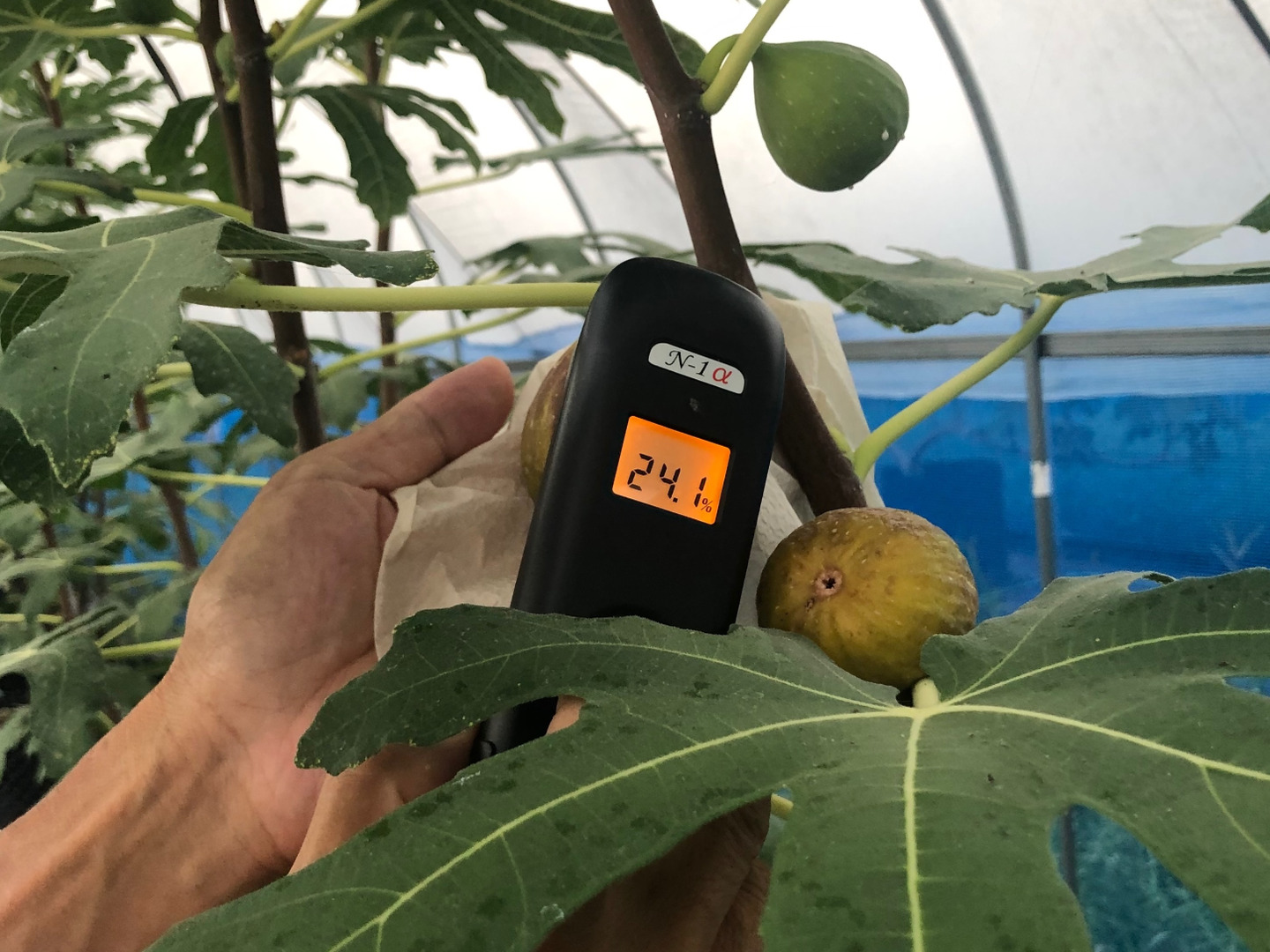 ・甘さの育成:イチジクの甘さは水分管理が重要。全てのイチジクは雨を防ぎ風通しの良いネット張りハウスで栽培し、朝晩の海陸風で実は常に乾いた状態に。散水タイマーとミストスプレーにより水分管理し、大型ポットで根域制限して育てています。
