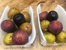 ・バナーネ:果皮は紫褐色、果肉は桃色、重量は30~115g、糖度は21〜25%。全体的にねっとりとした甘みが強く、タネのプチプチ感も楽しめる。皮ごと食べられる。
