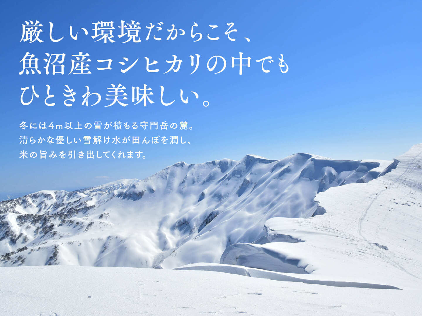 新潟・魚沼。守門岳の雪解け水と昼夜の寒暖差に育まれた、極上のコシヒカリ「雪の恵」。