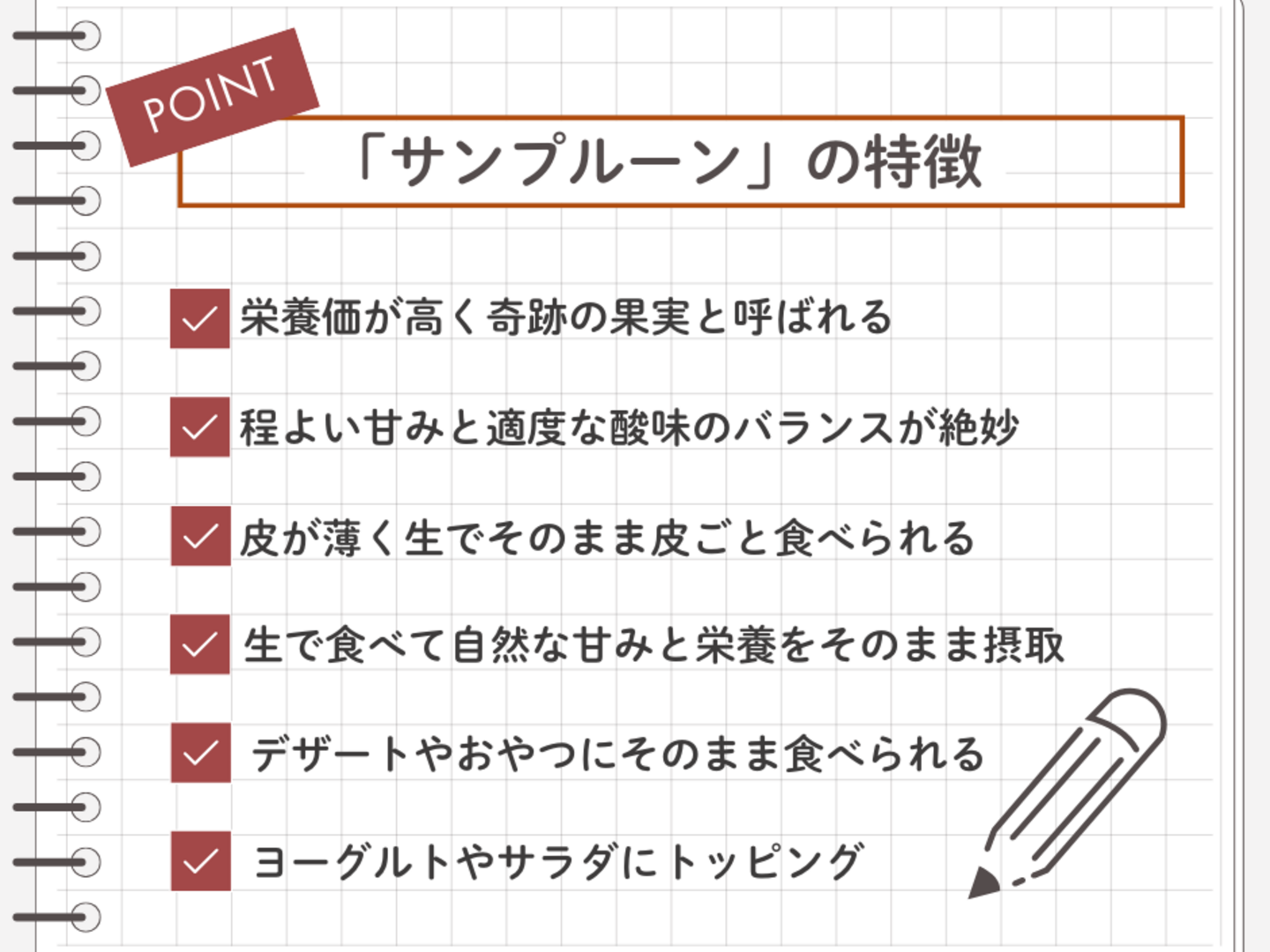 西洋スモモの一種である「サンプルーン」は、特に生食用のプルーンとして人気の高い品種になります。