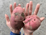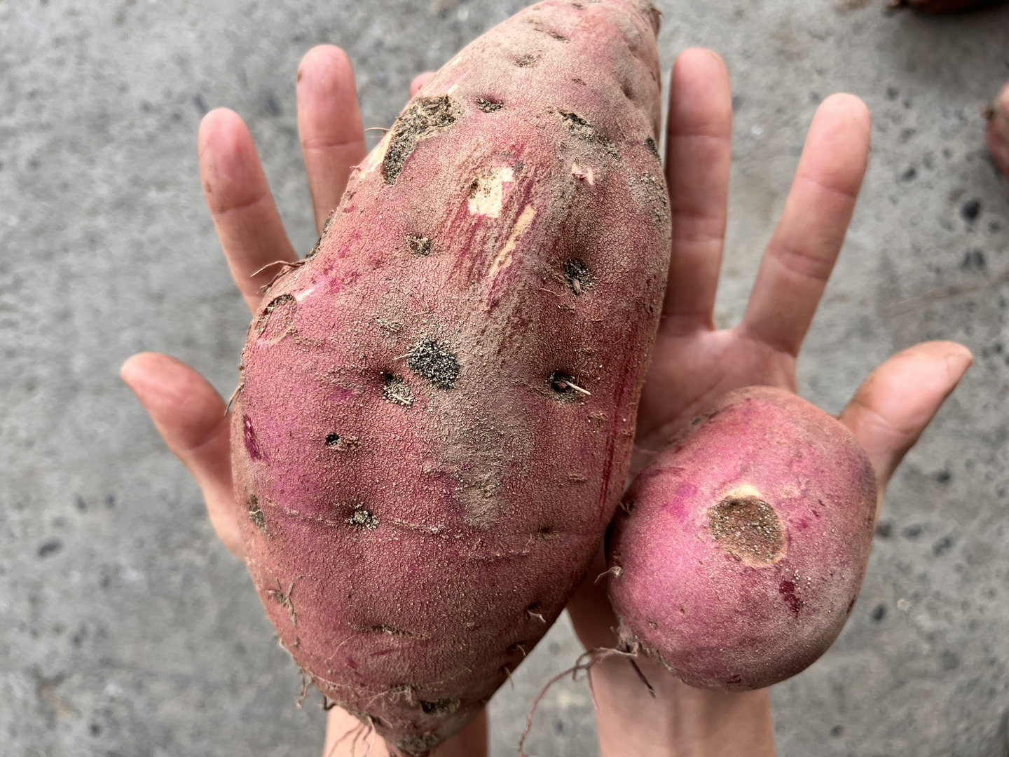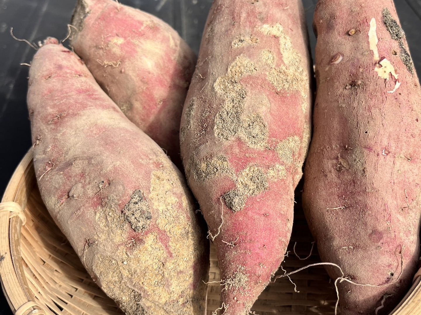 ●栽培中農薬不使用のため、自然本来の姿のままのさつまいもです。そのため虫食いや表面のへこみや形の不揃い、折れていたり切ってある、皮がむけていたり日焼けをしているものです。