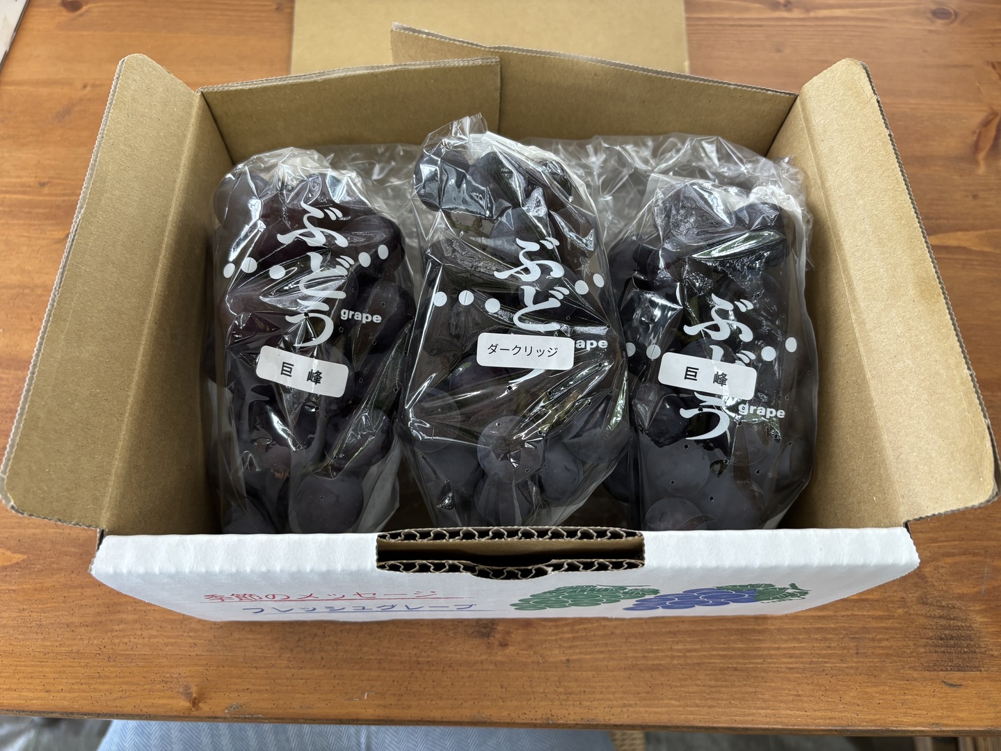 基本は『巨峰』となります。収穫状況により『伊豆錦』『ダークリッジ』など、他の品種が入る場合もございます