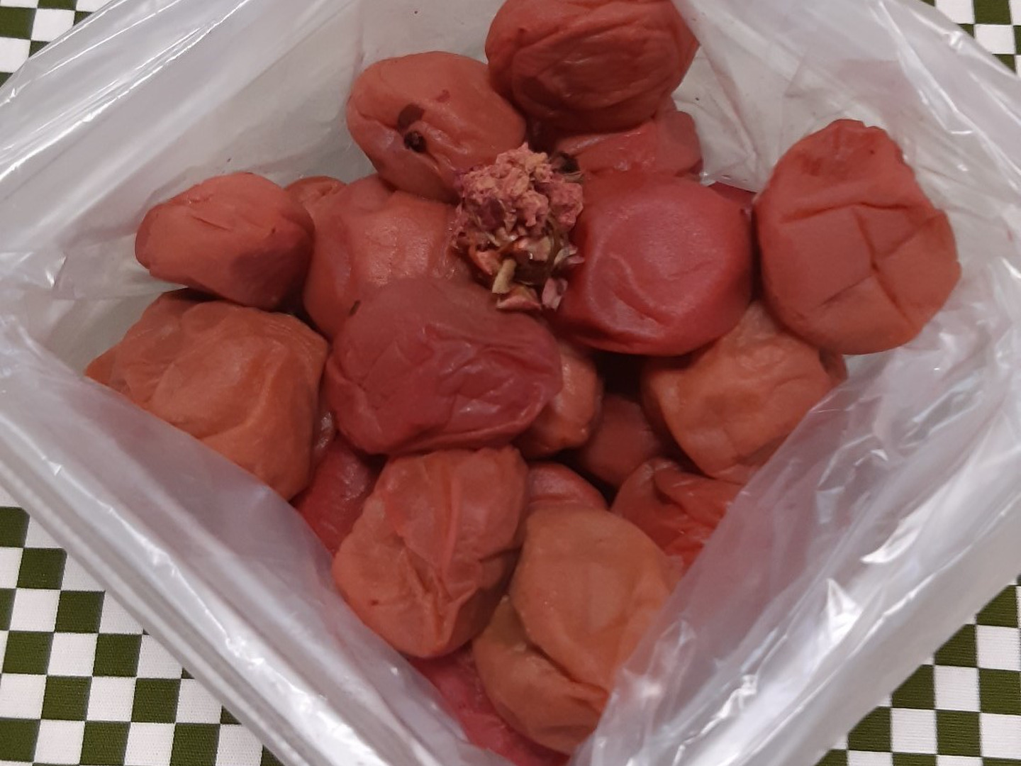 なお、今回、「さくら梅干し」としていますのは、この4月に八重桜の花びらを乾燥塩漬け(失敗しましたが・・・)にしたものを、香りづけに付けてみました。もちろん食していただいて結構です(軸つきですが・・・)。ほのかに、桜の花の香りがします。