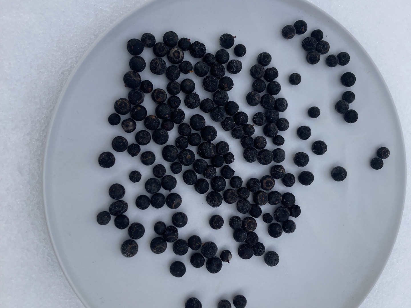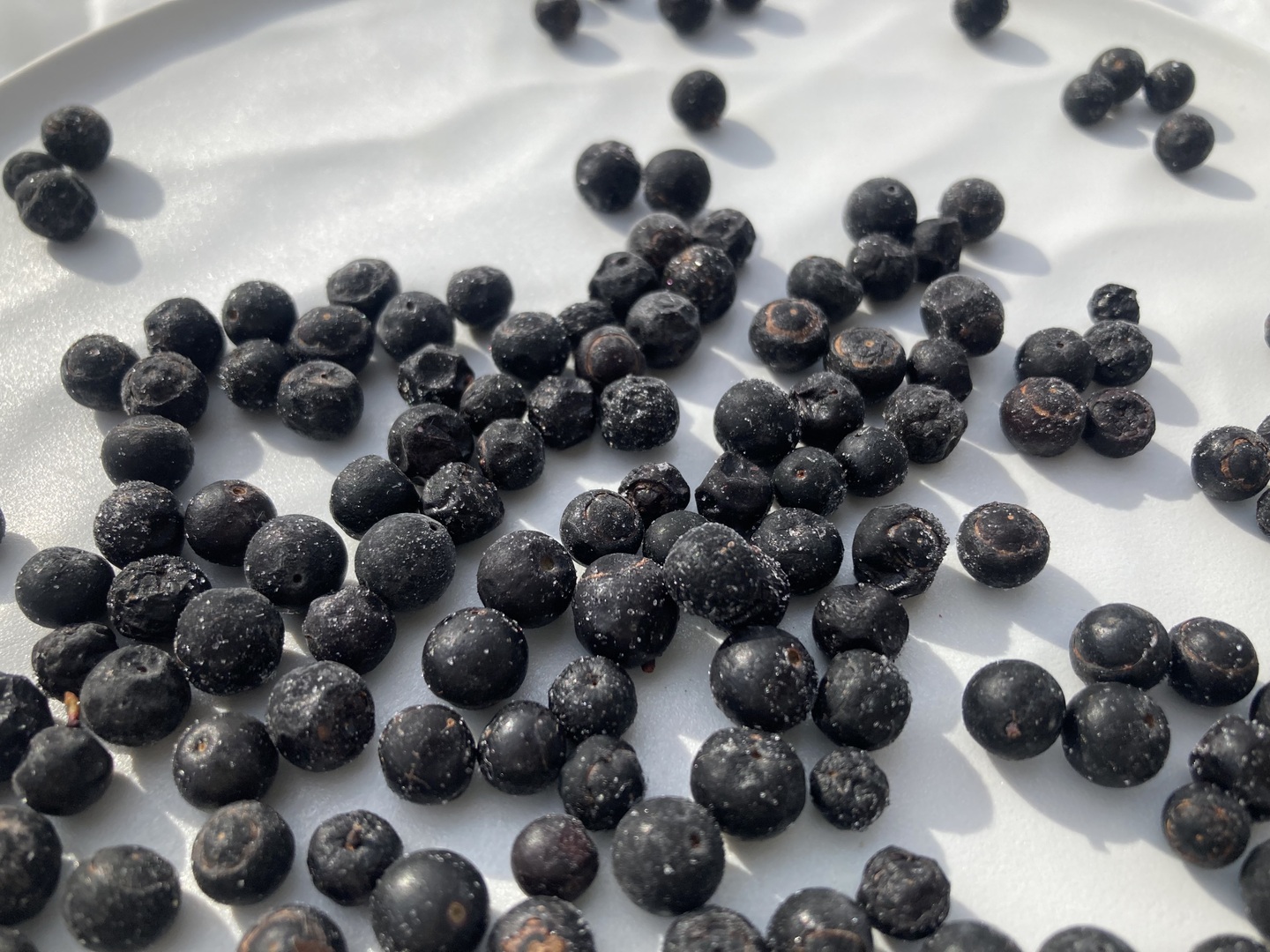 ブルーベリーの果実と比較すると皮は少し食感があり、噛むと皮が弾け、若干酸味のある野趣あふれる味が口に広がります。