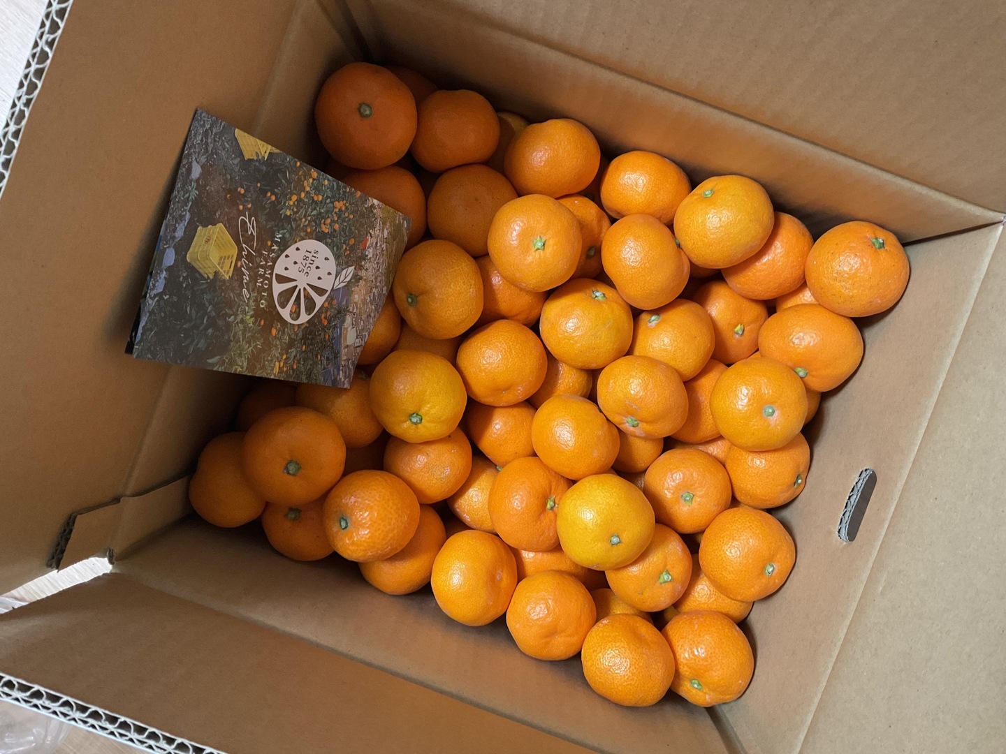 私たちの園地では、みかんを完熟ギリギリまで木にならせて収穫しています。そのため、収穫したては少し青みが残る事がありますが、これは新鮮な証拠です。数日おくと、きれいなオレンジ色に変わり、甘みもぐっと増していきます。ぜひ色づきや味の変化もお楽しみながらお召し上がりください。