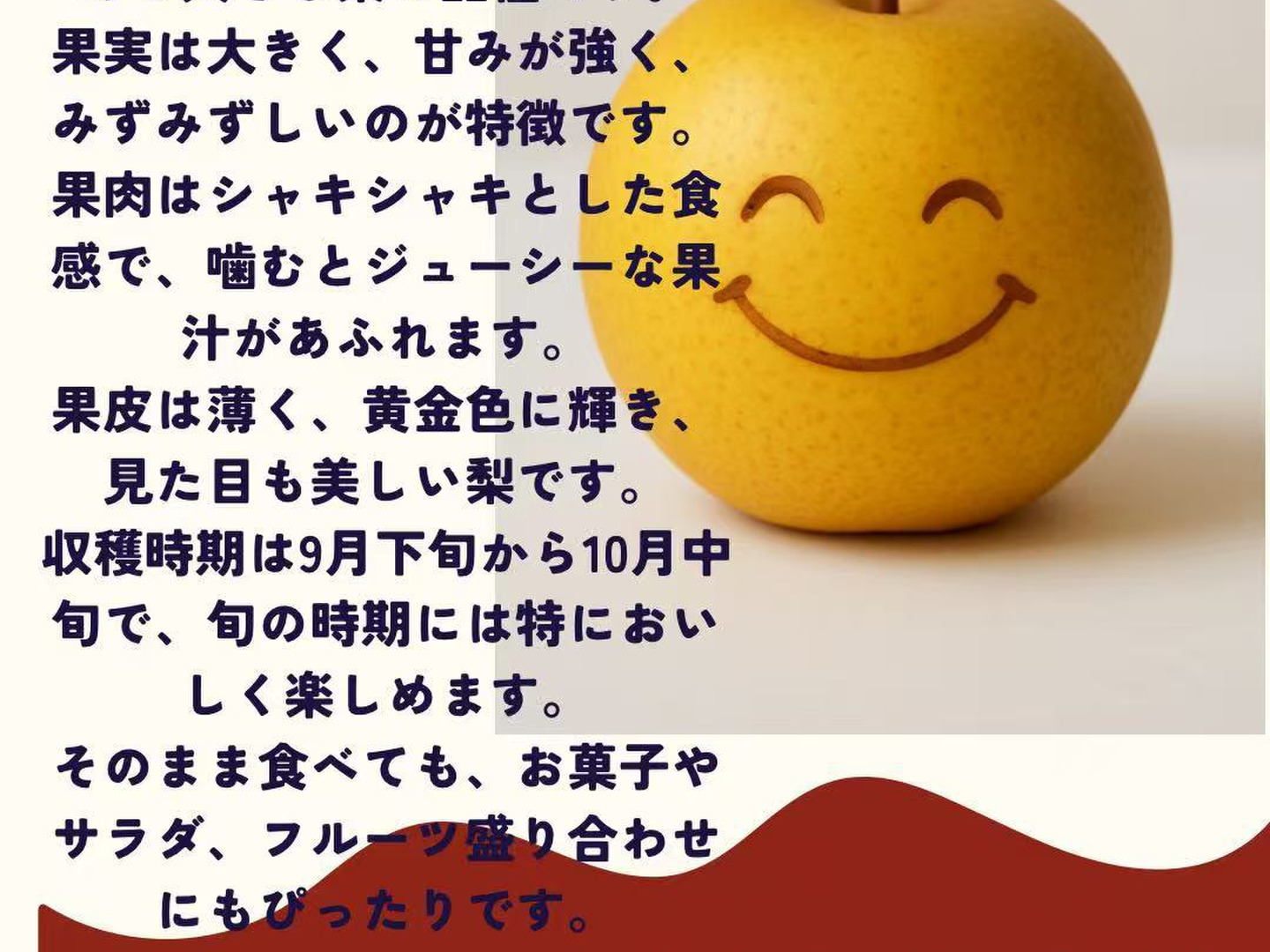 甘くてジューシー:豊水梨のジューシーさと新高梨の甘さを引き継いだ、果汁豊富で甘い味わいが特徴です。