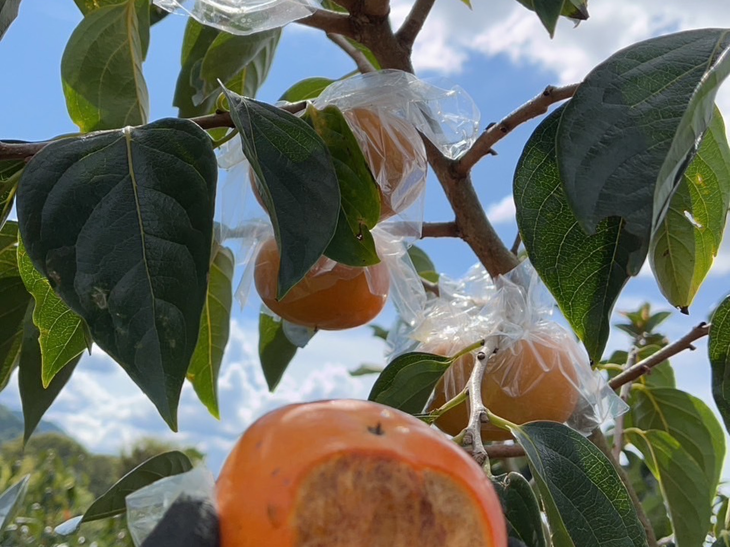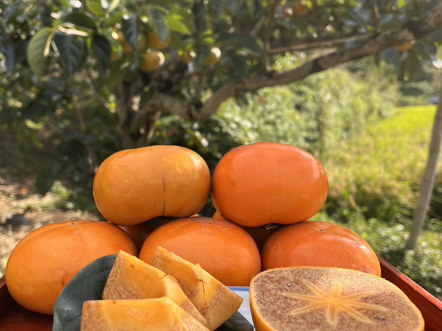 紀の川段丘の肥沃な山の土で栽培され、高低差のある山地が実をいっそう甘く引き立たせます。除草剤は不使用で柿の木にも負担を無くしています。